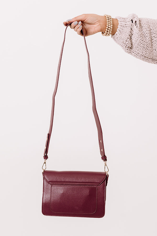 Make a statement with our stylish windsor wine colored 'Golden Era' crossbody featuring sleek lightweight faux leather material, a flap closure with a gold snap, an extra outside pocket, a wide removable shoulder strap, and a spacious fully lined rectangular pouch with additional inside pockets!