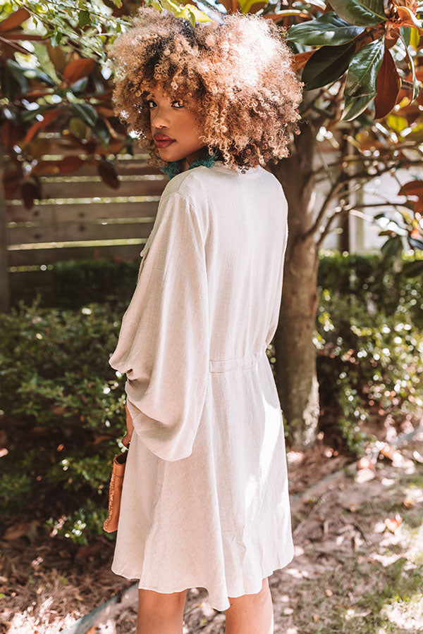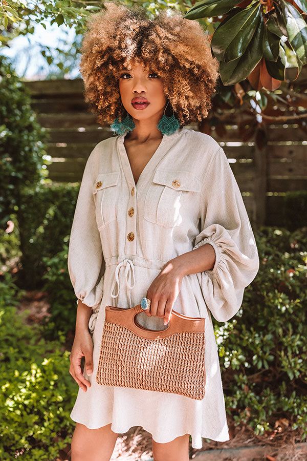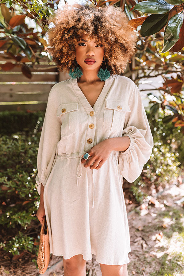 Transition from season to season in style with our versatile stone colored "Golden Gate Bridge Dress" featuring lightweight material, a button up bodice with a v-cut neckline, long oversized bubble sleeves with fitted elastic banded cuffs, a cinched waistline with a tie belt, two accent chest pockets with flap closures, and a relaxed skirt silhouette that falls into a straight mid-thigh length hemline! We have styled this year round essential with a neutral heel and brown clutch, but you can also wear it with "The Alba West in Rust" and our "Bombay Boardwalk Paisley Hair Scarf in Rust!" Measurements