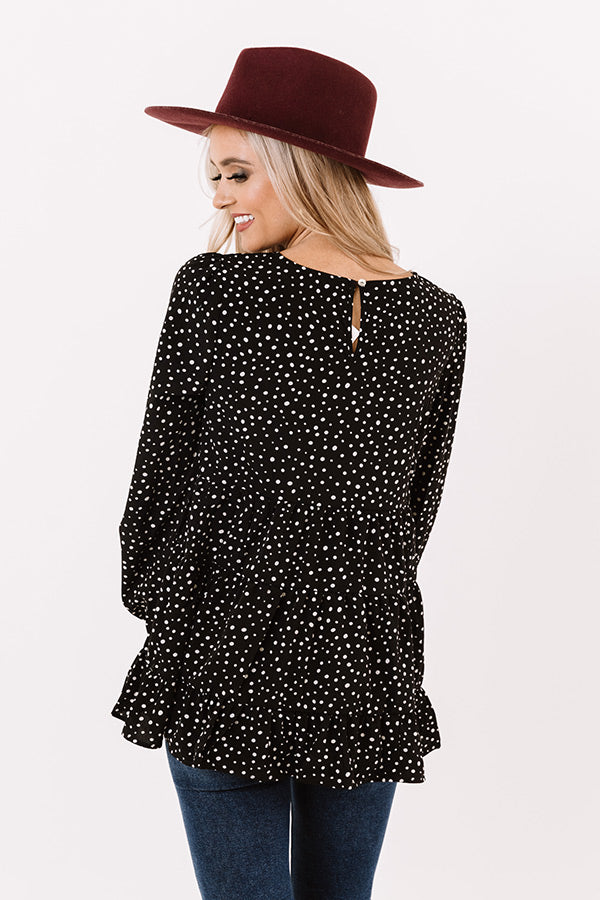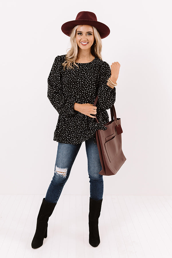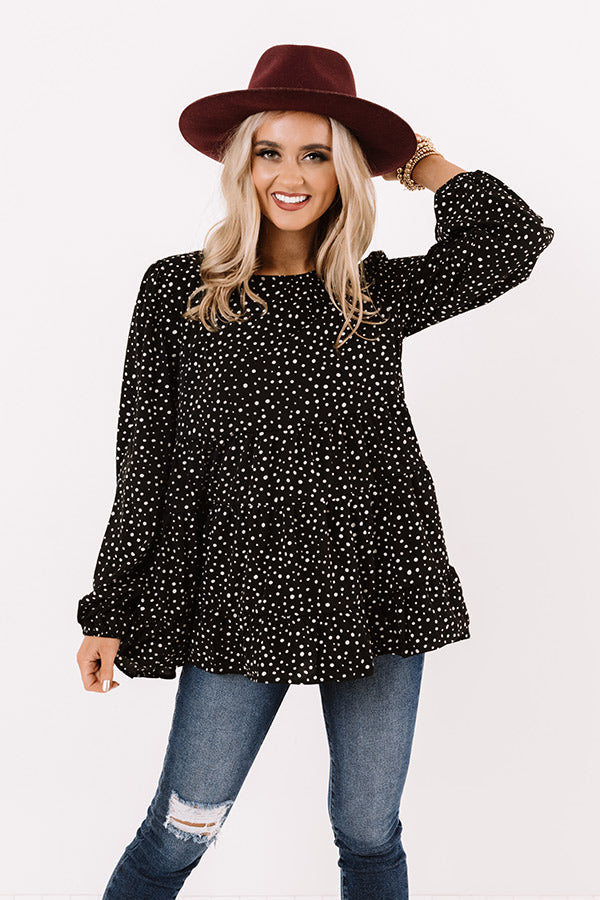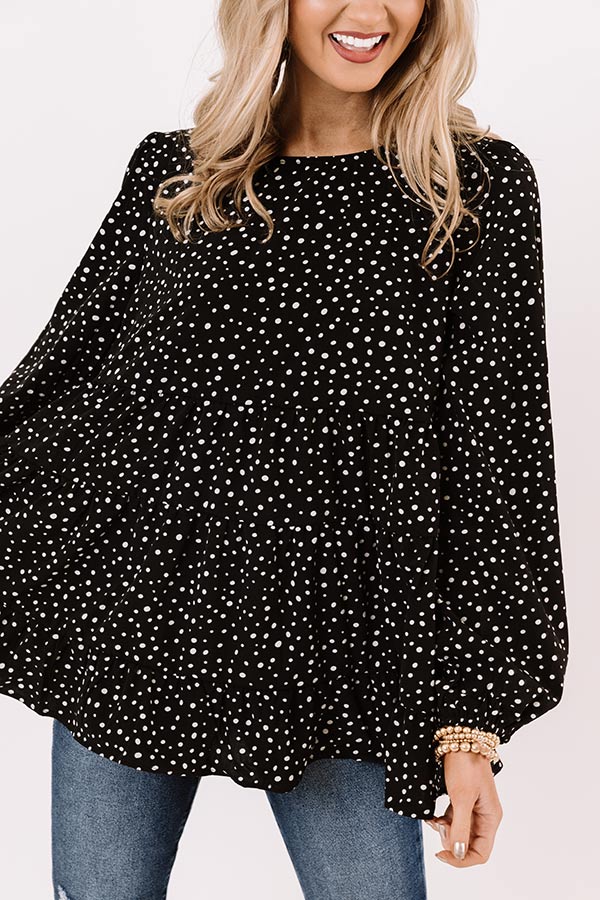 We have no doubt you will look like a golden girl in this darling black top featuring lightweight flowy material patterned with a small white spotted print, long loose sleeves with cinched cuffs, a high rounded neckline, a keyhole accented upper back with a button closure, and a tiered babydoll silhouette that falls into an uneven hemline! Measurements