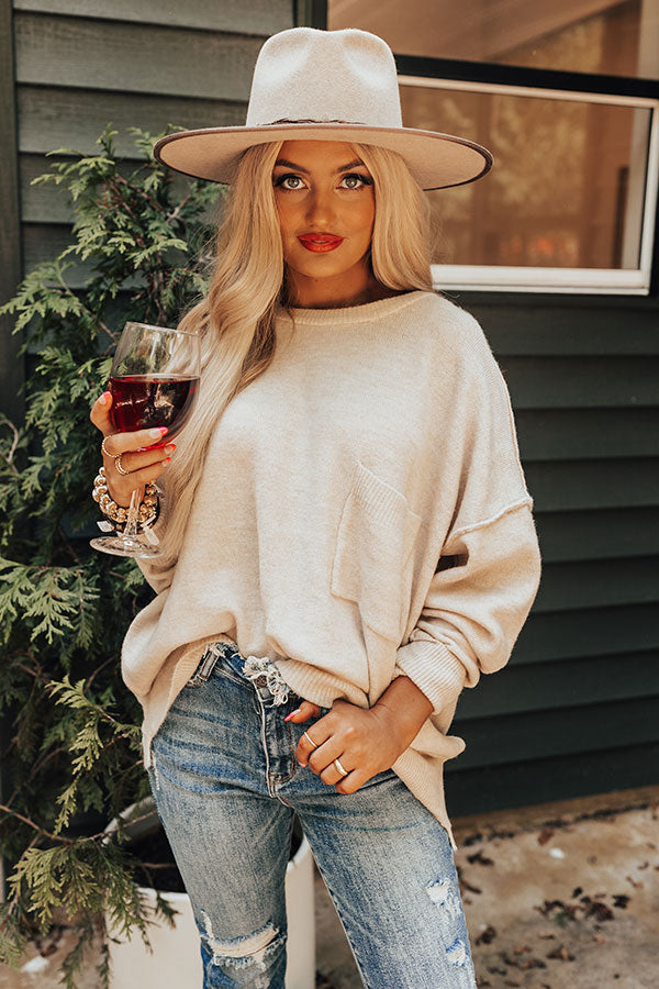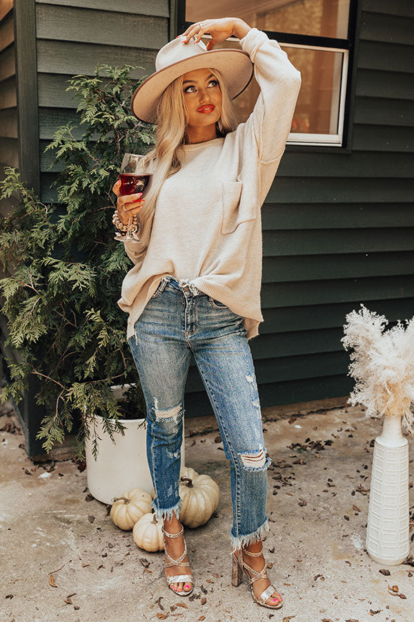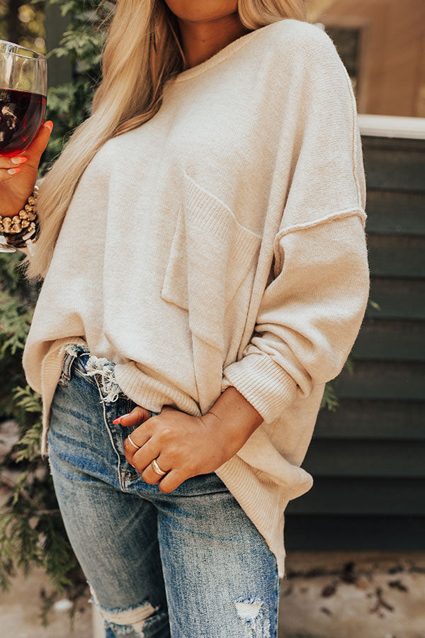 People will surely see you in a golden light when you complete your look with this versatile cream colored shift sweater featuring soft tight knit material, a rounded neckline, long loose sleeves, a single accent chest pocket, and a relaxed silhouette that falls into a straight tunic-length hemline! Measurements