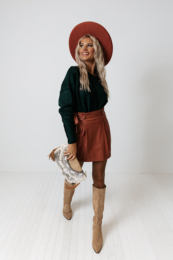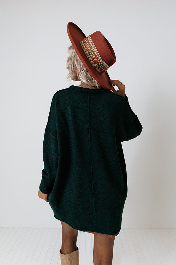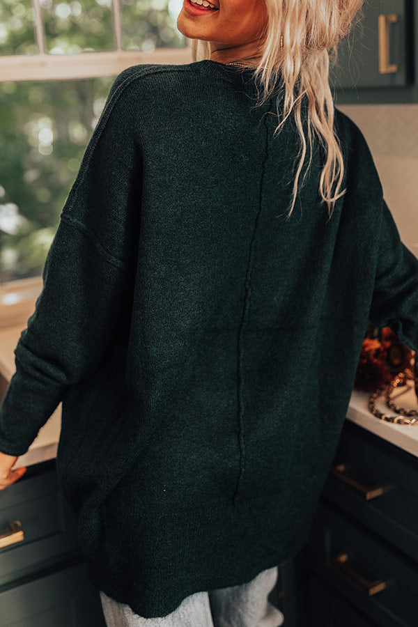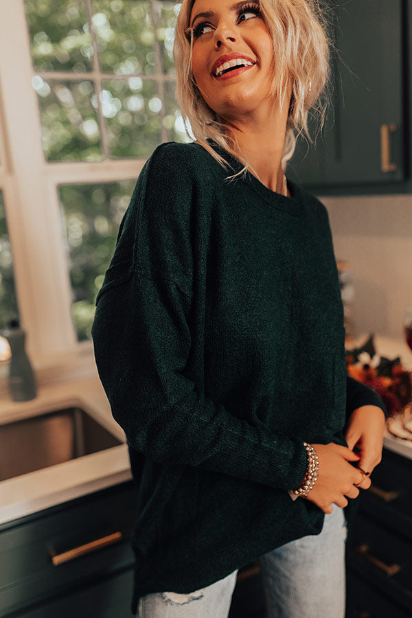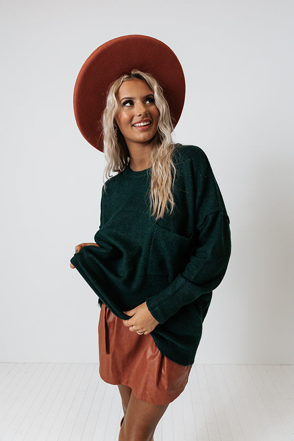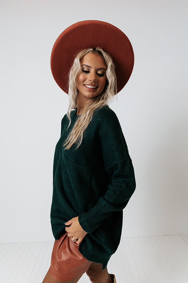 People will surely see you in a golden light when you complete your look with this versatile dark forest colored shift sweater featuring soft tight knit material, a rounded neckline, long loose sleeves, a single accent chest pocket, and a relaxed silhouette that falls into a straight tunic-length hemline!