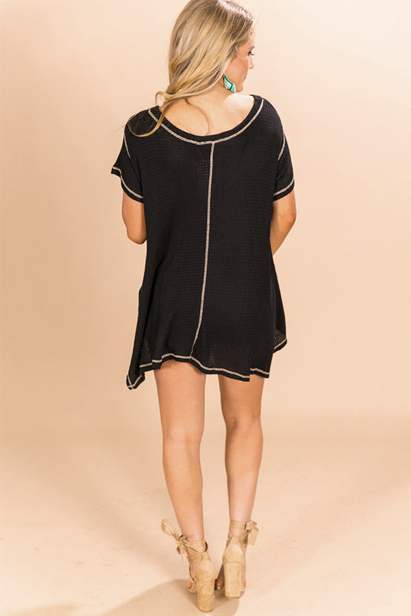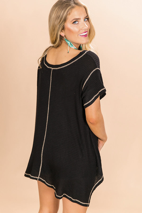 The "Gone Glamping Shift Top" is sure to make you one happy camper! This basic everyday babe has short sleeves, a v-cut neckline, a relaxed waffle knit shift bodice with exposed seams & an asymmetrical handkerchief hem. Style this stylishly simple sweetie with your favorite denim for a look that's perfect for all of your afternoon adventures!