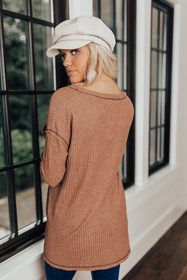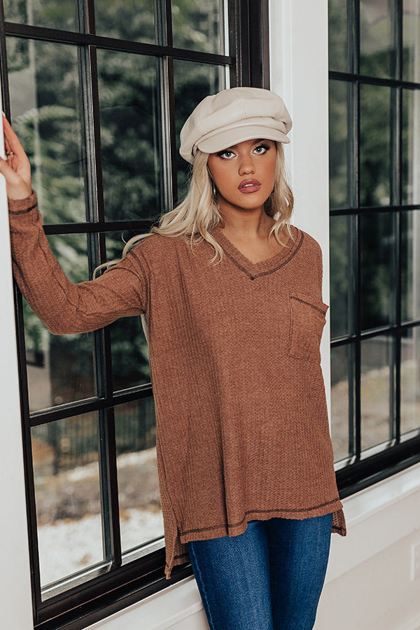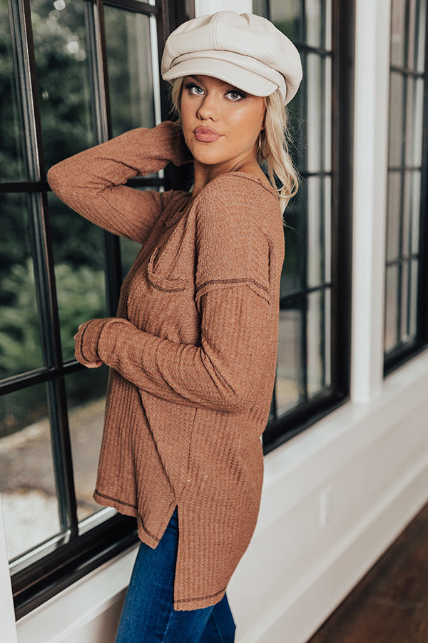 We have no doubt you will have a good attitude about your OOTD when you wear this casual mocha colored top featuring lightweight material with waffle knit texturing, a v-cut neckline, long loose sleeves, a single accent chest pocket, and a slouched silhouette that falls into a straight hemline!
