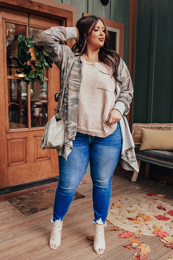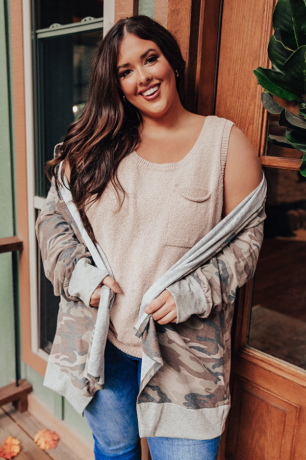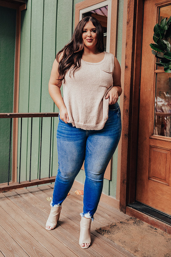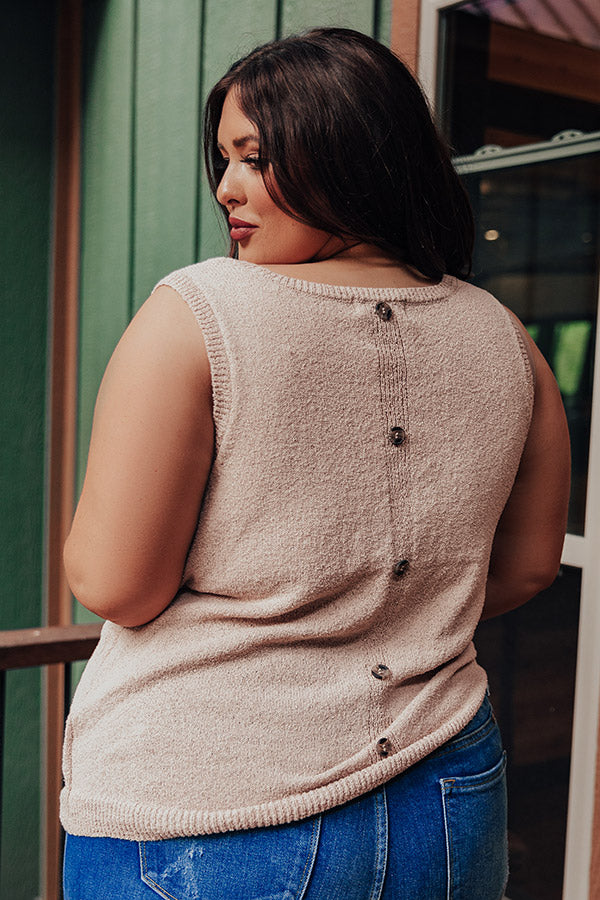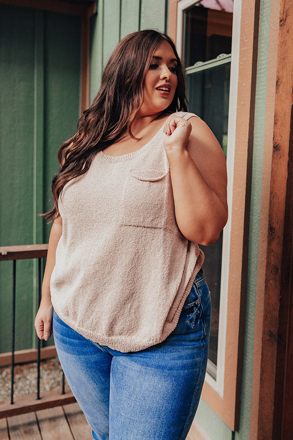 Plus Size - Believe us when we say our iced latte colored "Good Connection" top is a fall layering essential with its soft lightweight tight knit material, a scooped neckline, wide 3-inch sleeveless shoulder straps, a single accent chest pocket, ribbed trim detailing, a tortoiseshell button up back, and a relaxed silhouette that falls into a straight hemline! Measurements