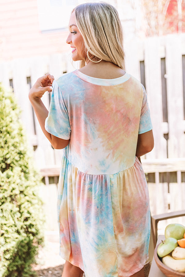 You are sure to have "good energy" when you wear this colorful dress featuring lightweight breezy material patterned with pink, yellow, and blue tie dye, a high rounded neckline, short loose sleeves, accent side pockets, and a relaxed babydoll silhouette that falls into a straight knee-length hemline! We have styled this summer cutie with some neutral wedges and a woven crossbody, but you can also wear it with clear sandals and sunglasses! Measurements