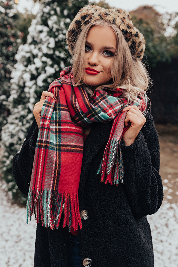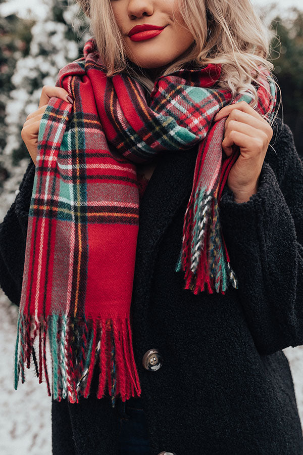 Add an extra accessory of warmth to your winter OOTD with our red "Good Girls Gone Plaid" scarf featuring soft lightweight material patterned with a green, black, and white plaid print and long fringed edge detailing!