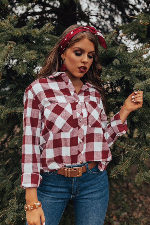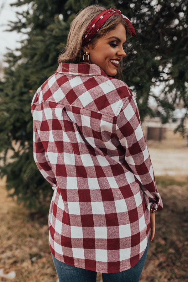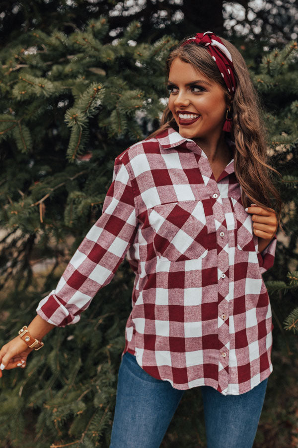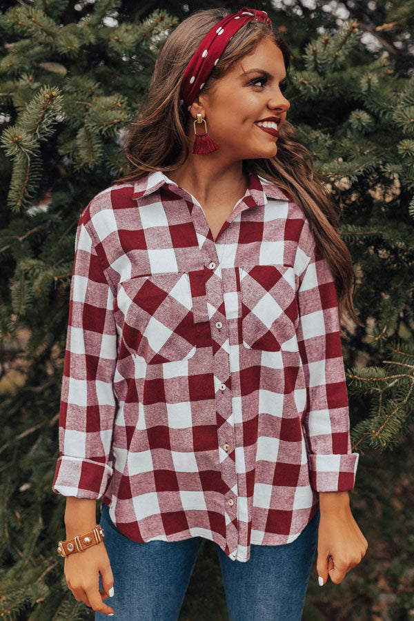 Channel the flannel in our "Good Girls Gone Plaid Top" featuring lightweight material patterned with a dark red and white plaid print, a high collared neckline, long lose sleeves with fitted button closure cuffs that can be rolled, two accent chest pockets, and a relaxed button up silhouette that falls into a rounded hemline! We have styled this winter classic with frayed denim skinnies, a matching hair scarf and earring, and a neutral belt and bracelet, but you can also wear it with some distressed black flares, "The Emmaline Bootie in Wine," and our "Brooklyn Babe Faux Leather Tote in Black!" Measurements