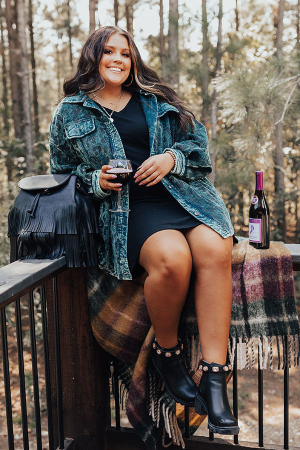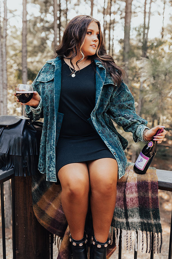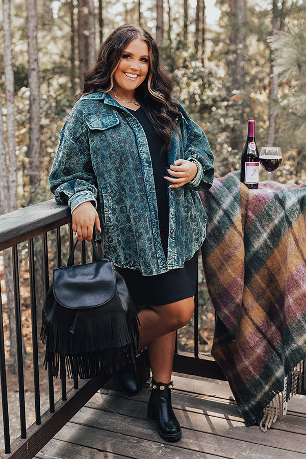 You will for sure have a good outfit day when you complete your look with this trendy plus size teal colored jacket featuring corduroy material patterned with a black leopard print, a button down front with a collared neckline, long loose sleeves with button closure cuffs, two low pockets and two chest pockets with flap closures, and a relaxed silhouette that falls into a rounded hemline!