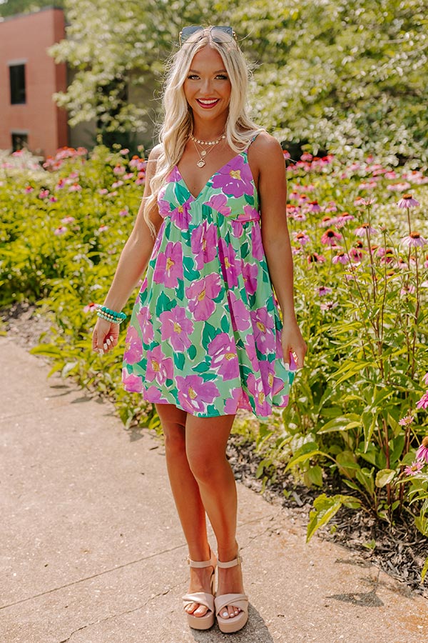 There are sure to be good vibes only when you arrive in this adorable ocean wave hued dress featuring lightweight breezy material patterned with a green and orchid hued floral print, a v-cut neckline with adjustable spaghetti straps, a tie belt, and a relaxed silhouette that falls into a straight mid-thigh length hemline!