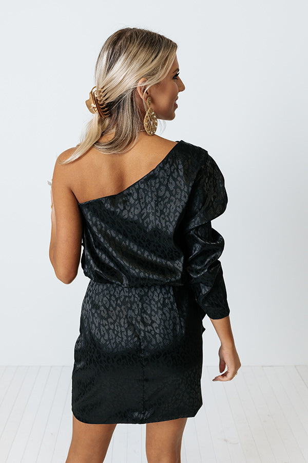 Step out looking amazing in this gorgeous little black one shoulder dress featuring chic satin material patterned with a subtle leopard print, a diagonal neckline with a single puff half sleeve, a cinched waistline, and a flattering silhouette that ends in a straight mid-thigh length hemline! Measurements