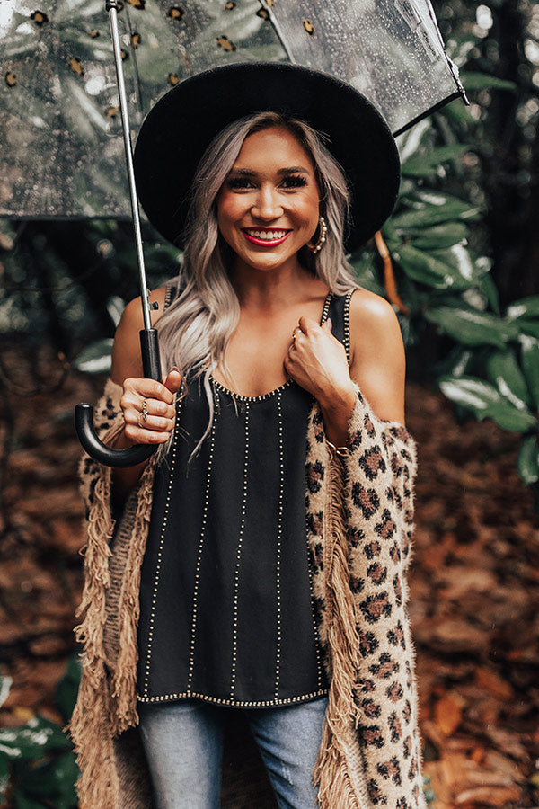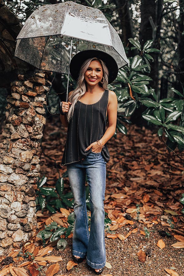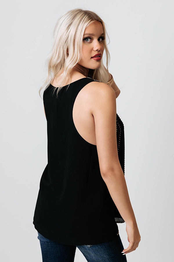 Dream big in our gorgeous black shift top featuring lightweight material with subtle gold stud detailing, a scooped neckline, wide sleeveless shoulder straps with a racerback fit, and a relaxed silhouette that falls into a straight hemline!