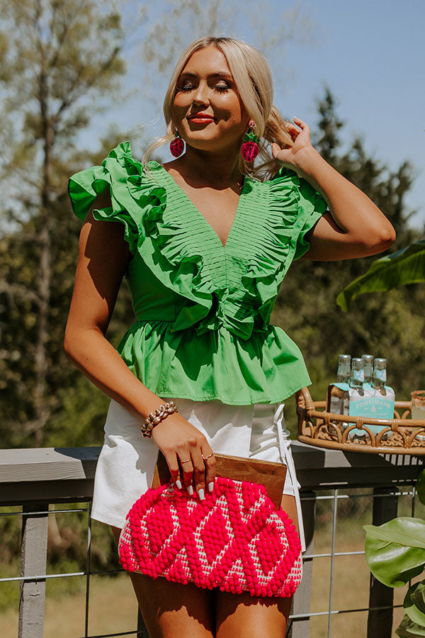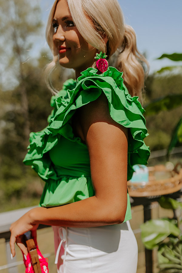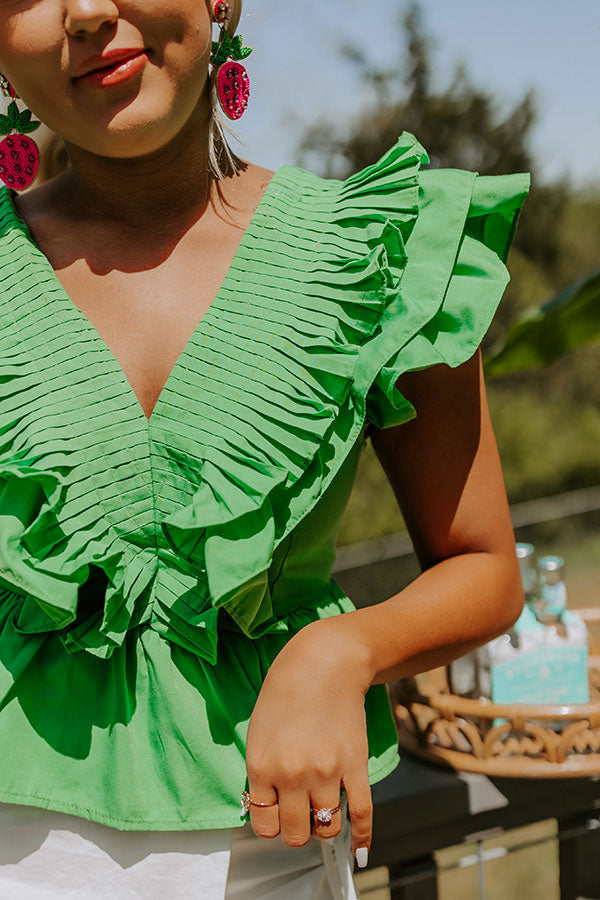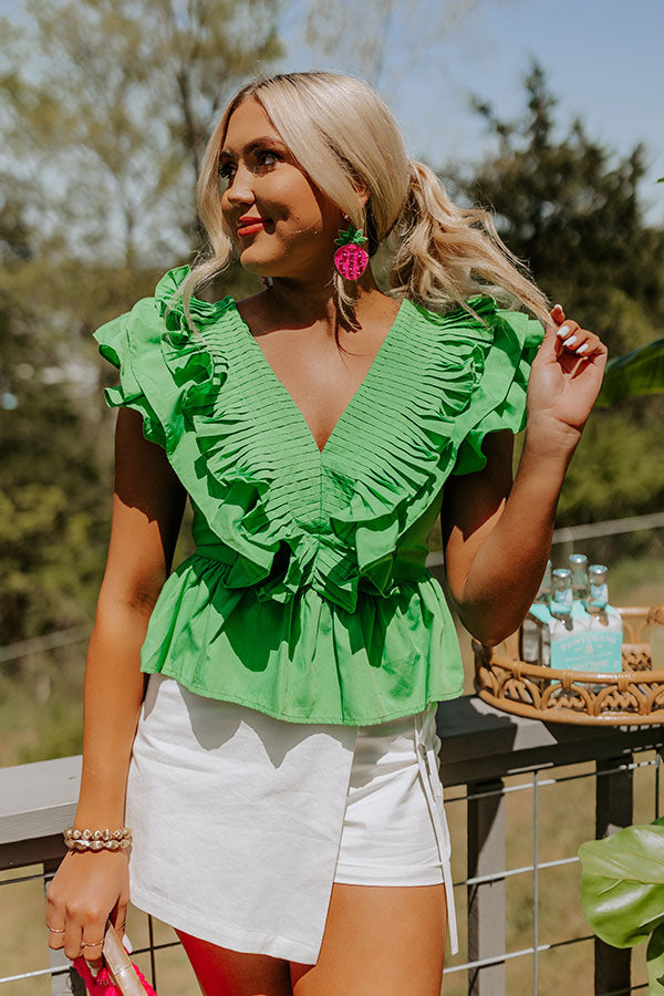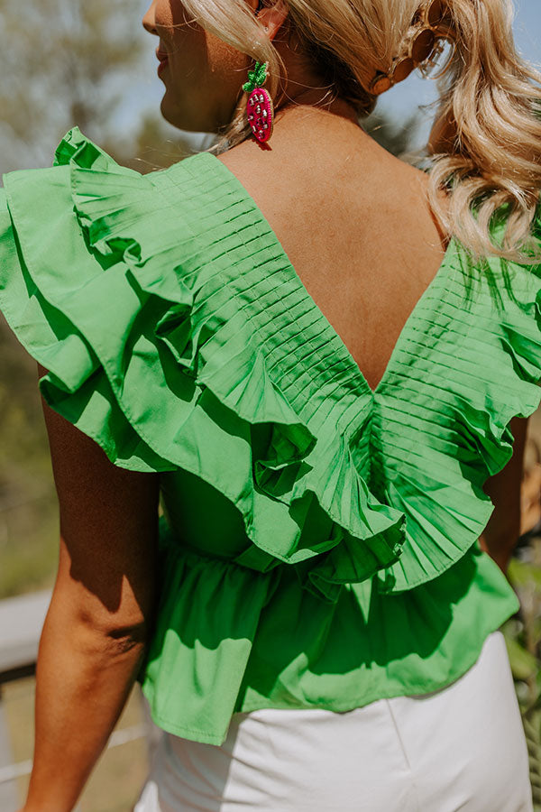 You will absolutely be one gorgeous girly when you complete your look with this darling kelly green top featuring lightweight material, a v-cut neckline and upper back, oversized tiered ruffle cap sleeves that extend down the bodice, and a flattering silhouette that ends in a straight peplum hemline! on products