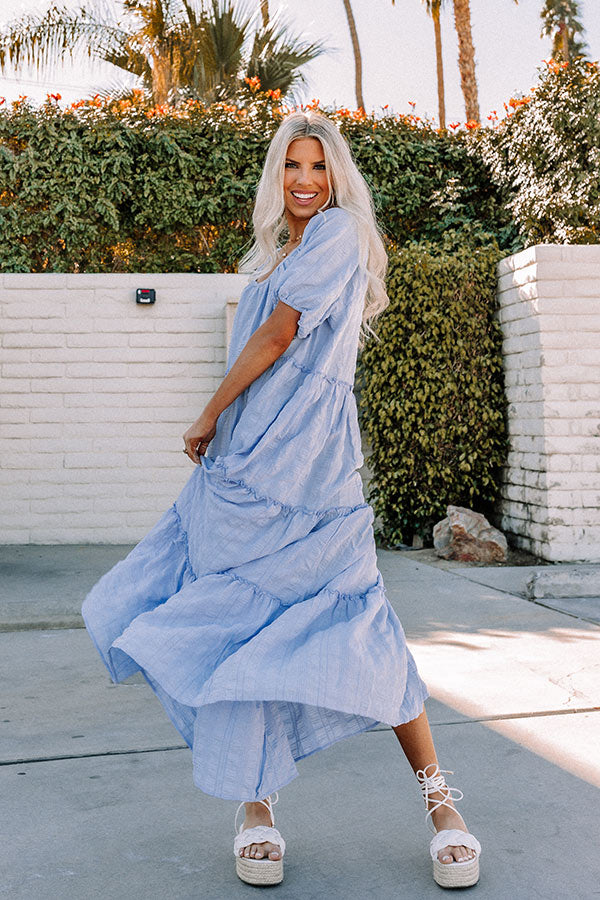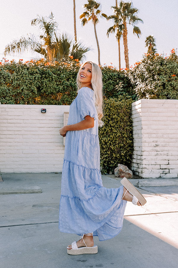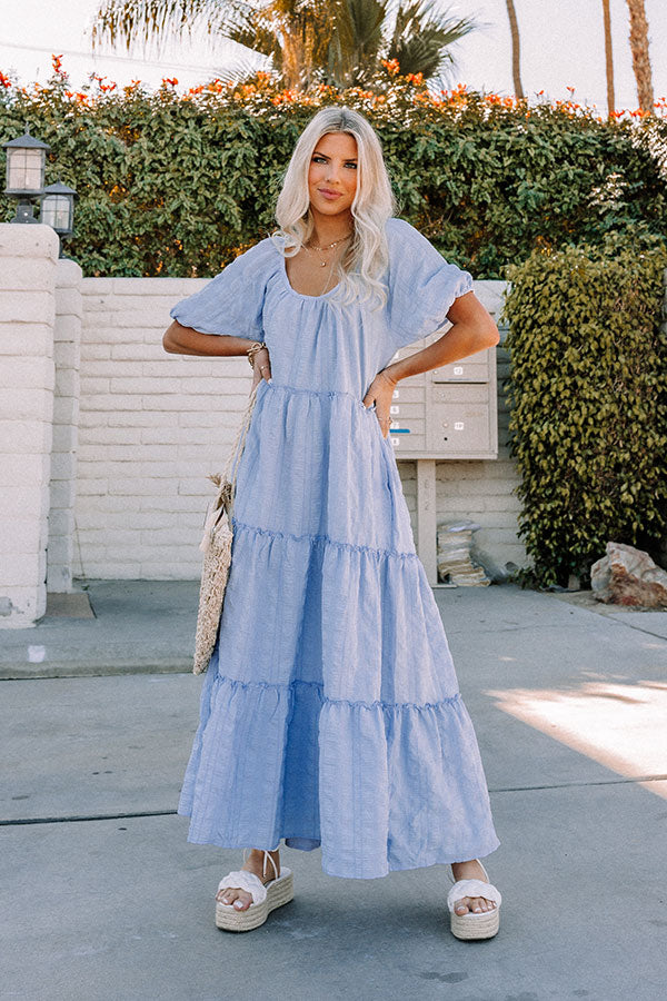 You will look like one gorgeous girly when you arrive in this stunning sky blue colored midi dress featuring lightweight material with puckered texturing, a scooped neckline, short puff sleeves, hidden side pockets, and an ultra relaxed tiered silhouette that cascades into a straight mid-thigh length hemline!