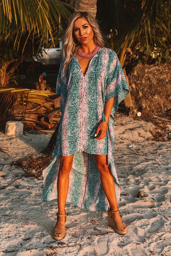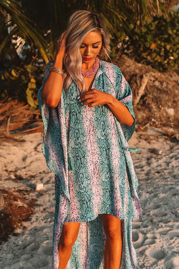 You will no doubt make a "gorgeous grand entrance" when you arrive in this femme and fierce dress featuring lightweight material patterned with a unique teal and neutral hued snake print, a v-cut neckline with a tassel string closure, oversized draped half sleeves, and an ultra relaxed silhouette that cascades into a straight high/low hemline with a mid-thigh front hem and an ankle length back hem! We have styled this chic piece with neutral wedges, but you can also wear it with "The Mara Sandal in Pink" and our "Sippin' At Sunset Sunnies in Pink!"