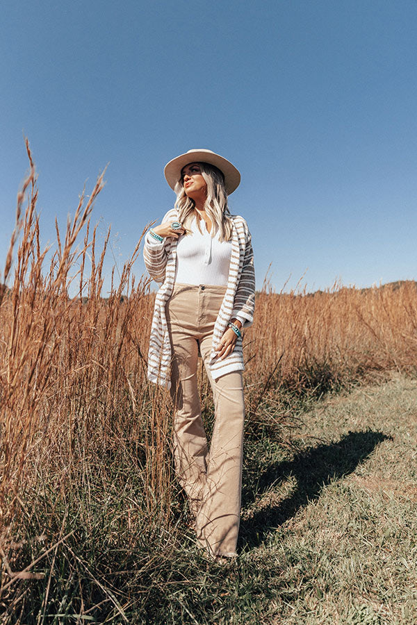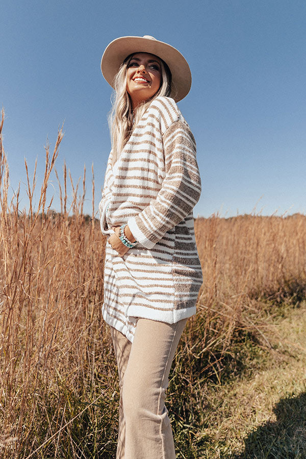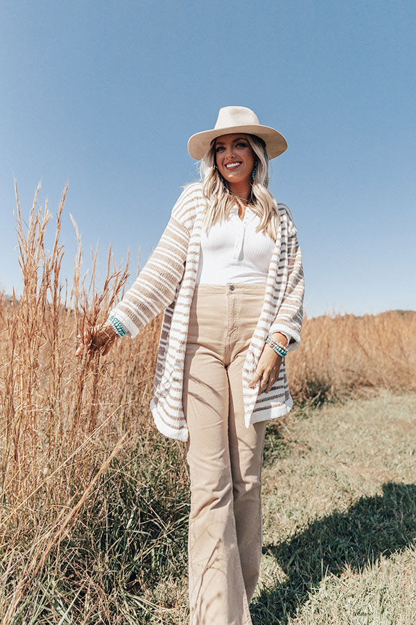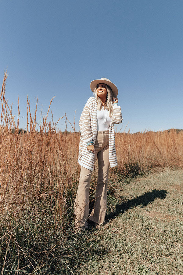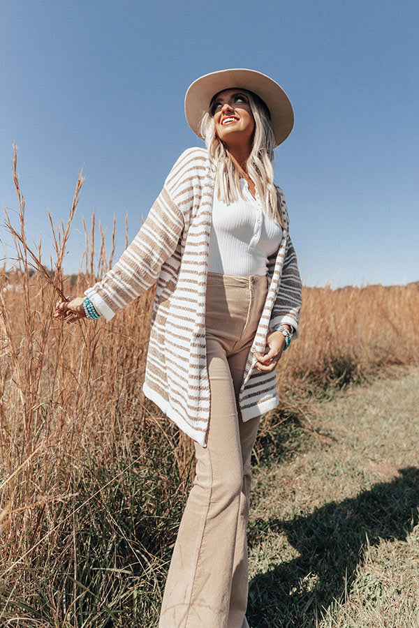 You won't find a warmer or more stylish piece to thrown on when you "gotta jet" than this adorable cardigan featuring soft lightweight tight knit chenille material with ribbed texturing, neutral and white accent stripes, and a relaxed open front silhouette that falls into a straight mid-thigh length hemline! You can style this versatile piece with just about anything from a basic tank to a sweater, jeans to skirts or dresses, booties to wedges or sandals, clutches to totes, and hats to earrings!