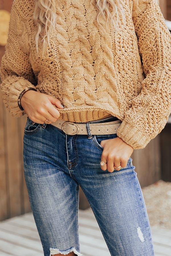 Tie your look together effortlessly with our practical birch colored 'Grace And Bliss Belt' featuring a woven textured strap with a gold hoop buckle! Belt Range: 29.5in-37in