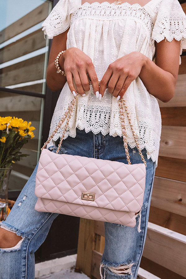 Upgrade your look with our adorable warm taupe colored 'Graceful Gala' clutch featuring checkered quilted texturing, a flap closure with twist hardware, a chain shoulder strap, and a spacious rectangular pouch!