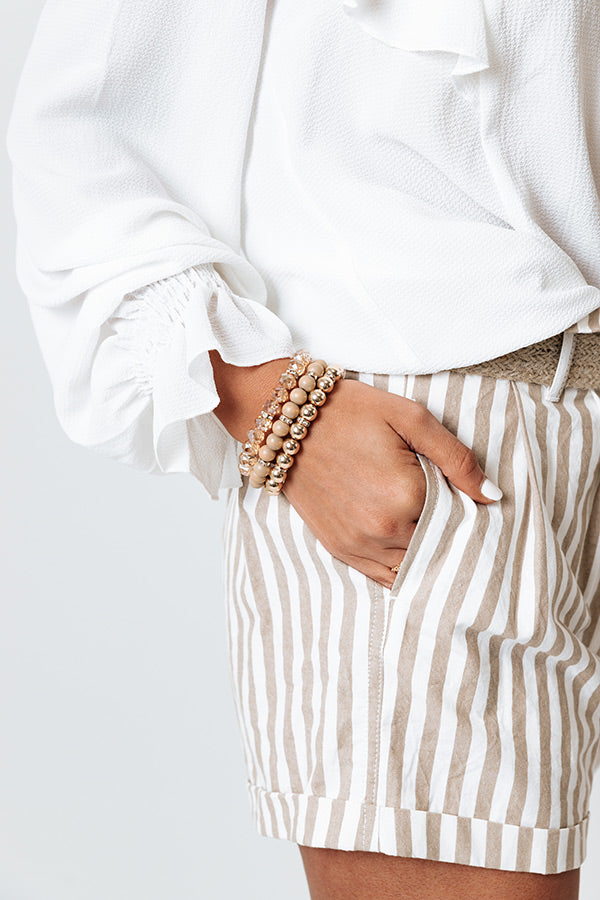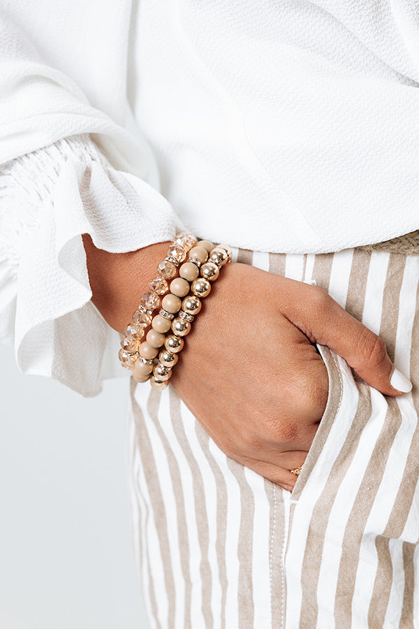 You are sure to catch people's gaze when accessorize with this graceful bracelet set featuring three stretchy bands with iced latte, gold, and clear beads!