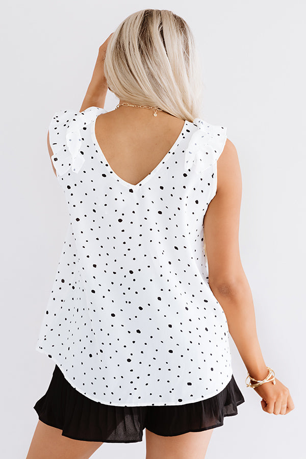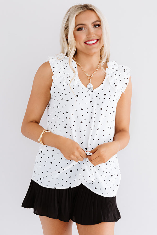 You are sure to look so graceful in this darling white shift top featuring lightweight material patterned with black various sized polka dots, a v-cut neckline and upper back, wide 3-inch sleeveless shoulder straps with oversized ruffle detailing, and a relaxed silhouette that falls into a rounded hemline! We have styled this cutie with some pleated shorts and a black platform heel and faux leather crossbody, but you can also wear it with some light wash flares, "The Emmaline Bootie in Black," and our matching black "Fated Love Wool Hat!" Measurements