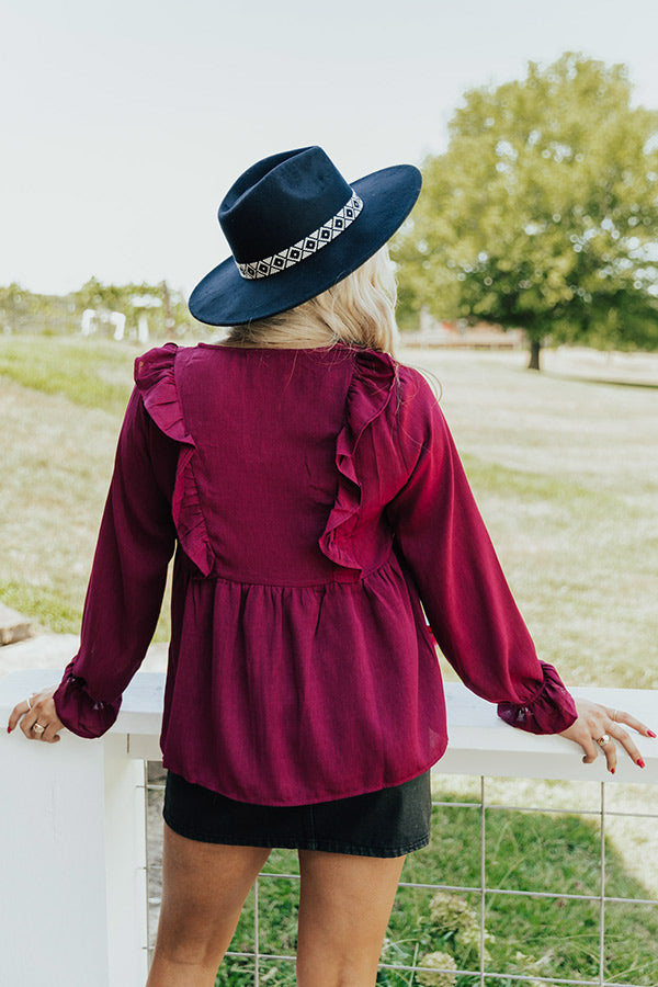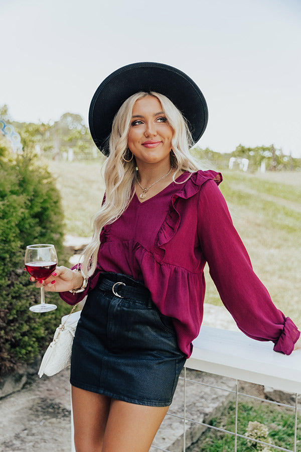We have no doubt you will look gorgeous in this darling windsor wine hued top featuring lightweight material with ruffled shoulder detailing, a v-cut neckline, long loose sleeves with flared cuffs, and a relaxed silhouette that falls into a straight hemline! Measurements