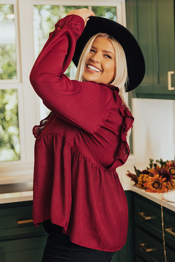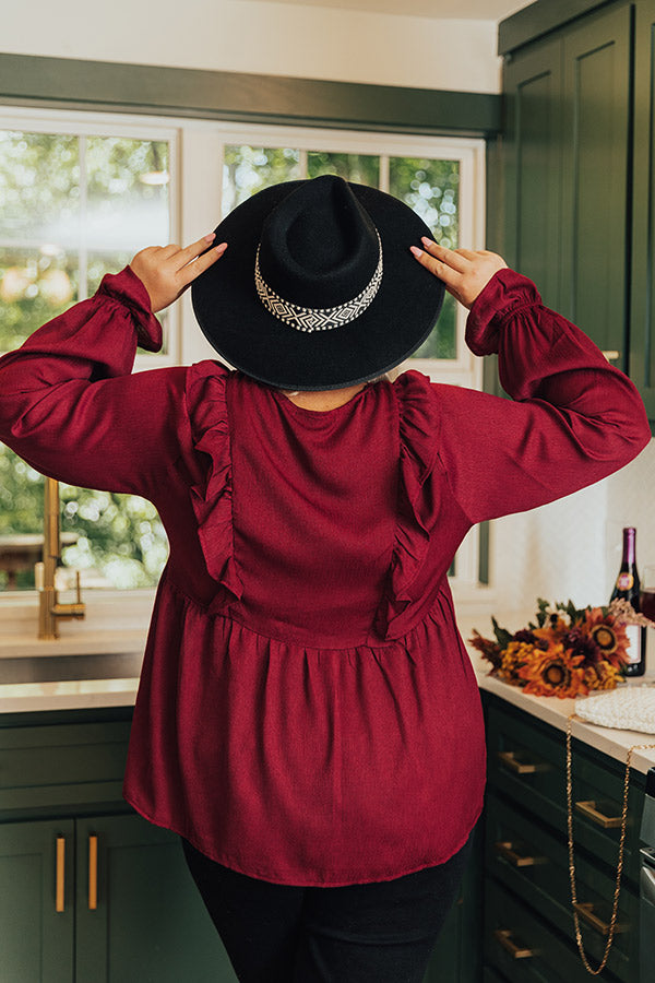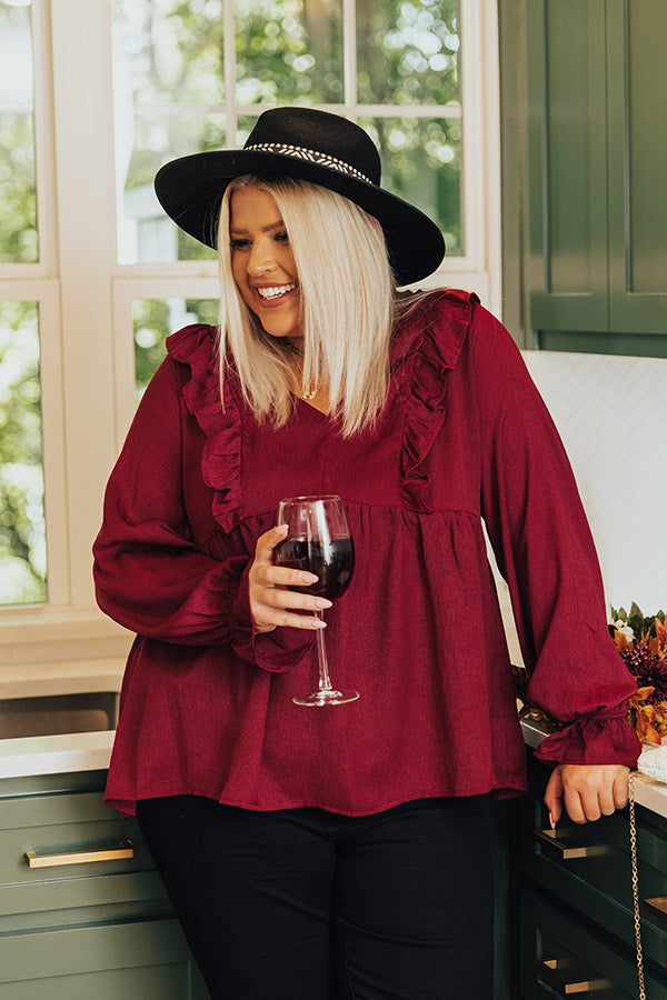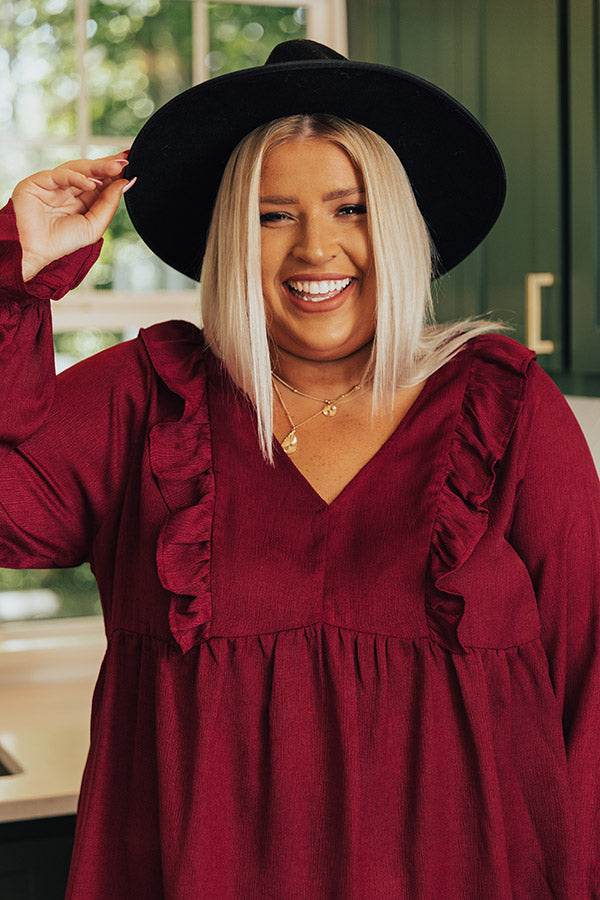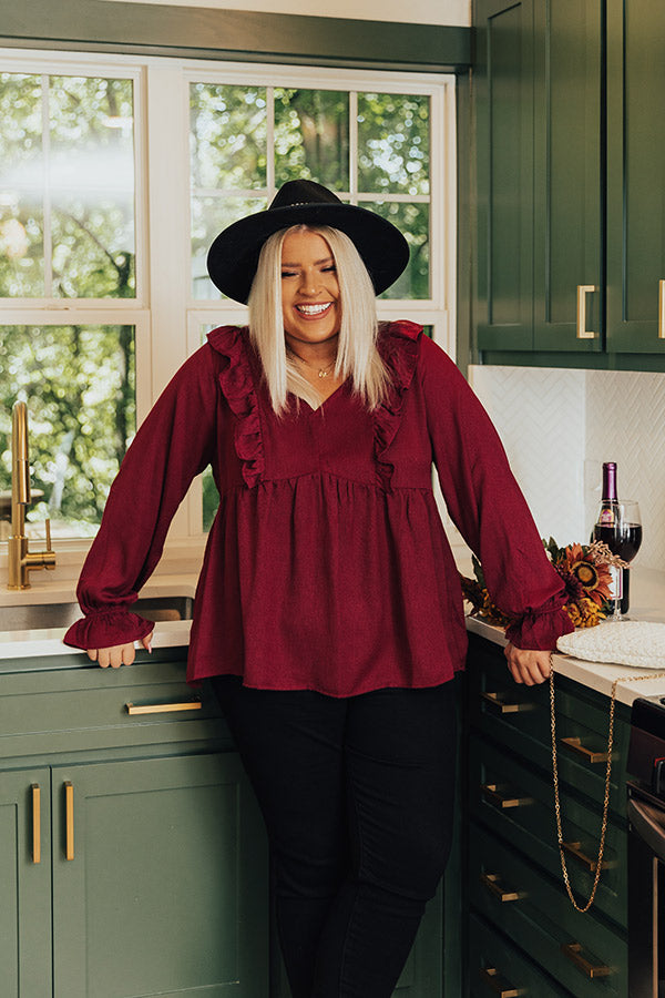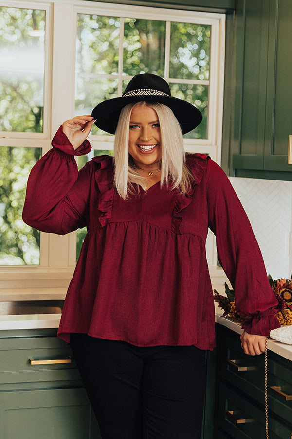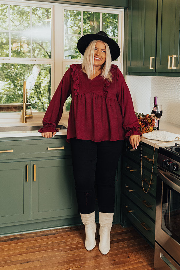 We have no doubt you will look gorgeous in this darling plus size windsor wine hued top featuring lightweight material with ruffled shoulder detailing, a v-cut neckline, long loose sleeves with flared cuffs, and a relaxed silhouette that falls into a straight hemline! Measurements