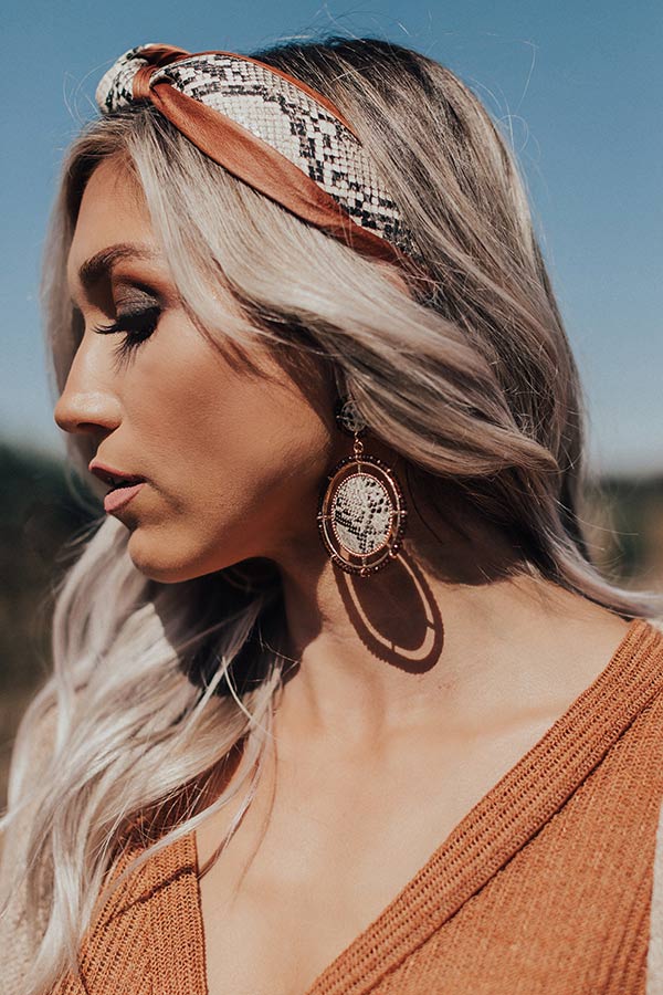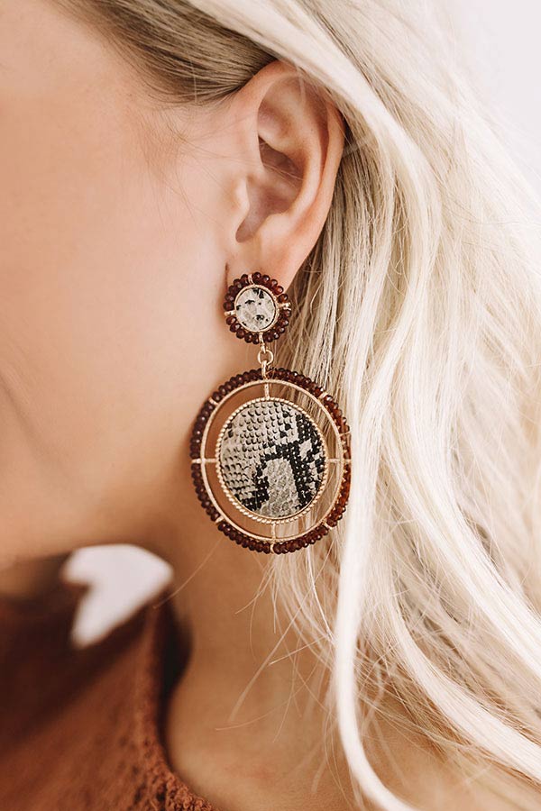 You will be making a "grand entrance" when you accessorize with these statement earrings featuring snake print circles in a gold setting surrounded by cinnamon colored beads!