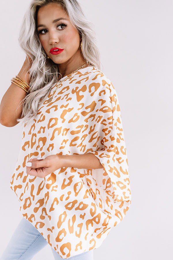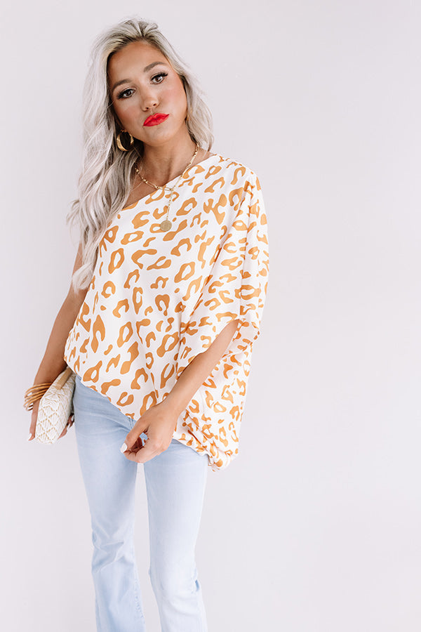 You are sure to make a grand entrance when you wear this stunning top featuring lightweight breezy material patterned with a large marigold colored leopard print, a diagonal neckline with a single oversized short bat wing sleeve, and an ultra relaxed silhouette that falls into an elastic hemline! This gorgeous piece styles perfectly with some light wash flares, neutral wedges, and a chic clutch, but you can also wear it with some distressed white shorts, "The Tessa Stud Sandal in Yellow," and our "Brighton Beach Babe Hat" for a variety of amazing evening looks! Measurements