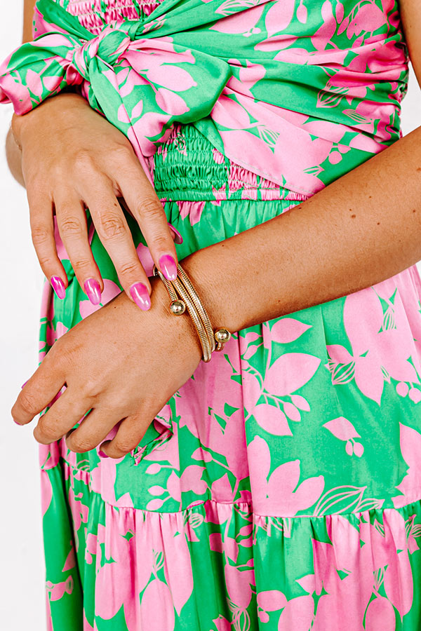 - This unique bracelet is a trendy option to elevate your look with a pop of gold!