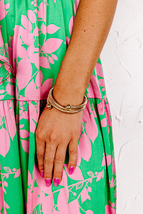 - A thick gold toned guitar string bracelet that coils around the wrist three times and ends in round end pieces
