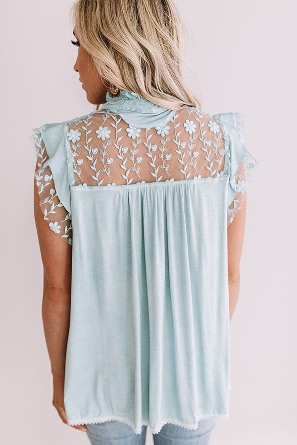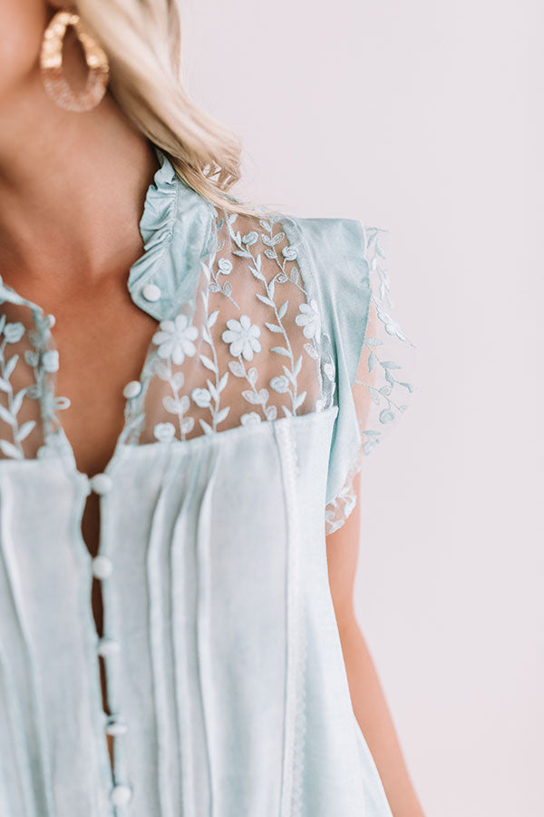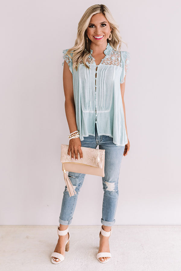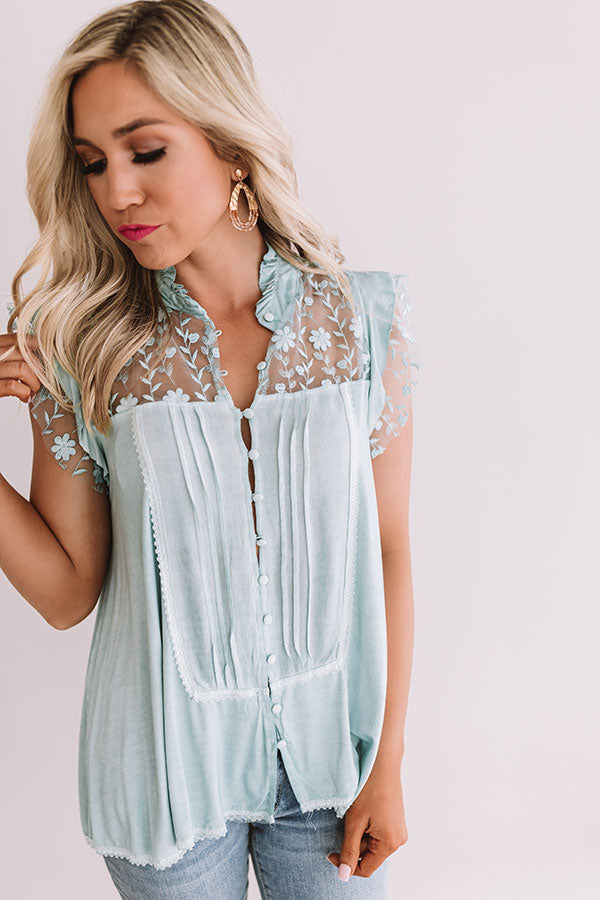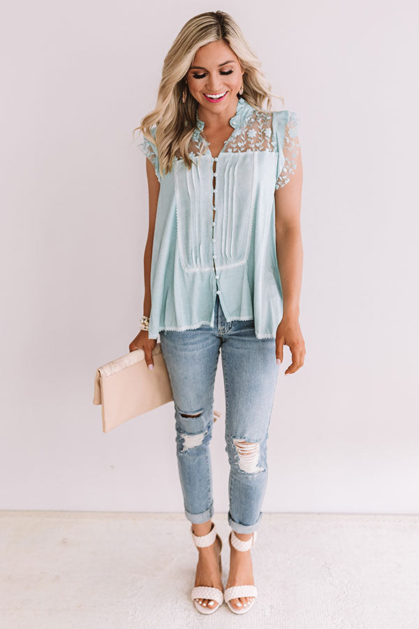 We guarantee you will have a grand time in this dainty button up that features sheer flower shoulders, a collar, and ruffle trim on the sleeves! Style this aqua top with a pair of high waisted striped shorts and neutral wedges for a unique and fashionable summer look! Measurements