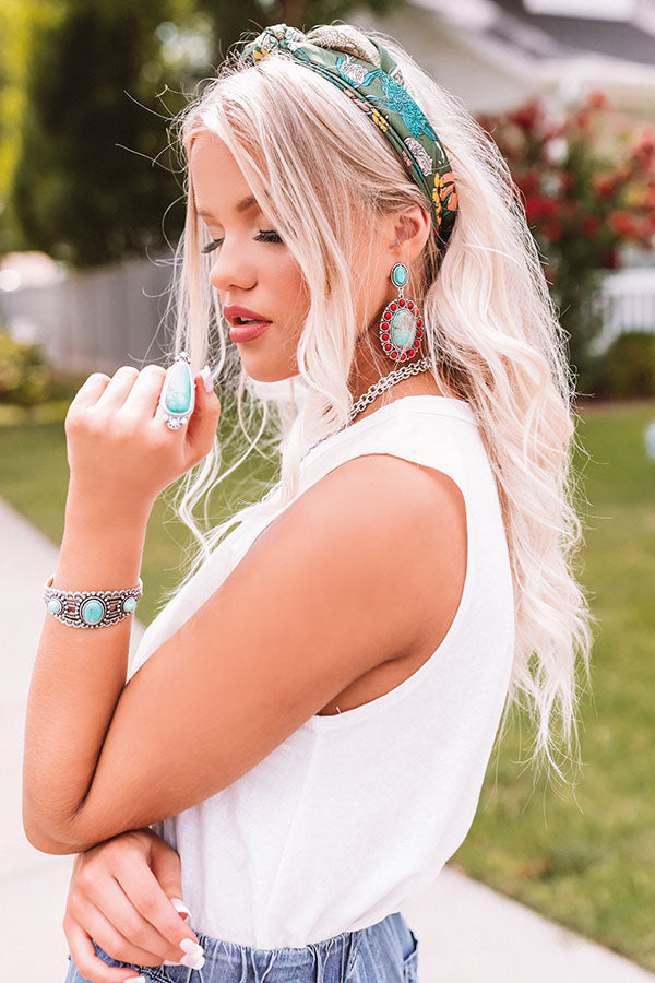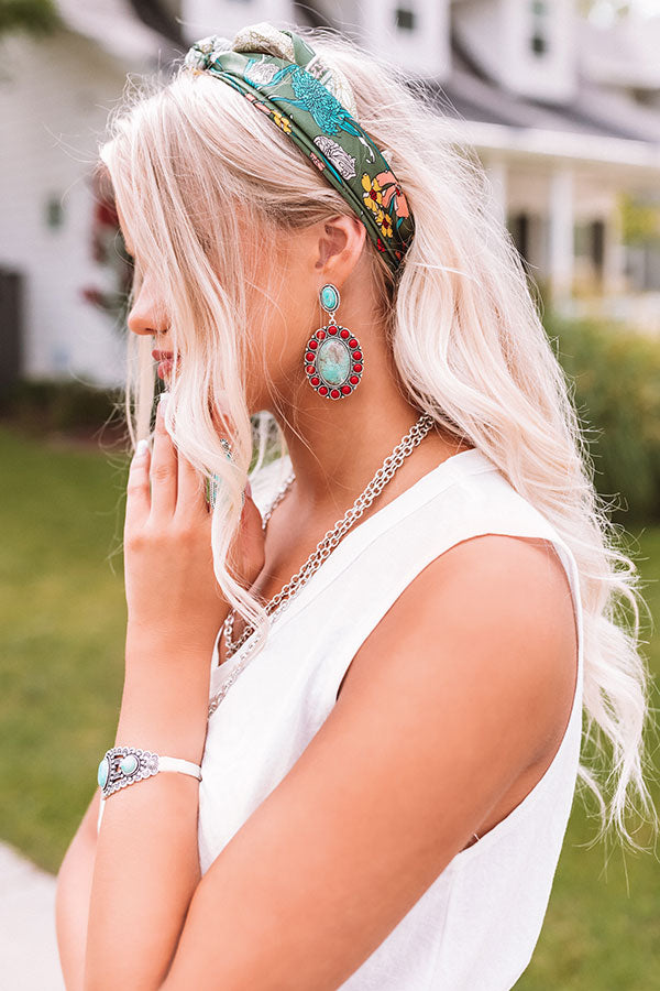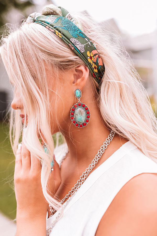 You are sure to turn heads in our stunning "Gratzi Bella" statement earrings featuring small turquoise studs and large dangling oval turquoise stones surrounded by red gems!