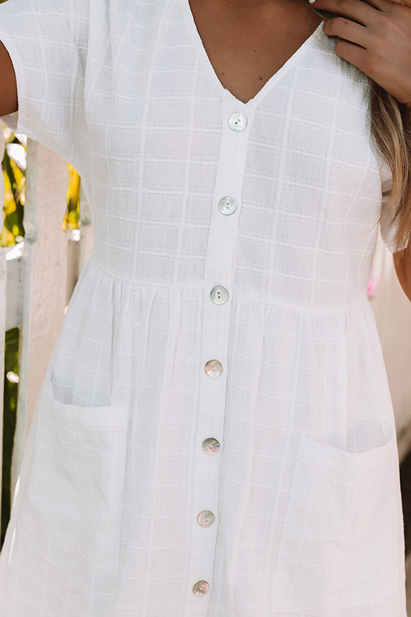You'll feel as free as the ocean in our adorable white "Grayton Beach" tunic dress featuring lightweight breezy material patterned with subtle checkered texturing, a v-cut neckline, short loose sleeves, a button down front with low accent side pockets, and a relaxed silhouette that falls into a straight mid-thigh length hemline! We have styled this cutie with some clear wedges and a straw hat, but you can also wear it with "The Tipton Espadrille in Grey," our "Spanish Coast Fringe Crossbody in Grey," and our "Poolside In Panama Sunnies in Silver!" Measurements