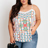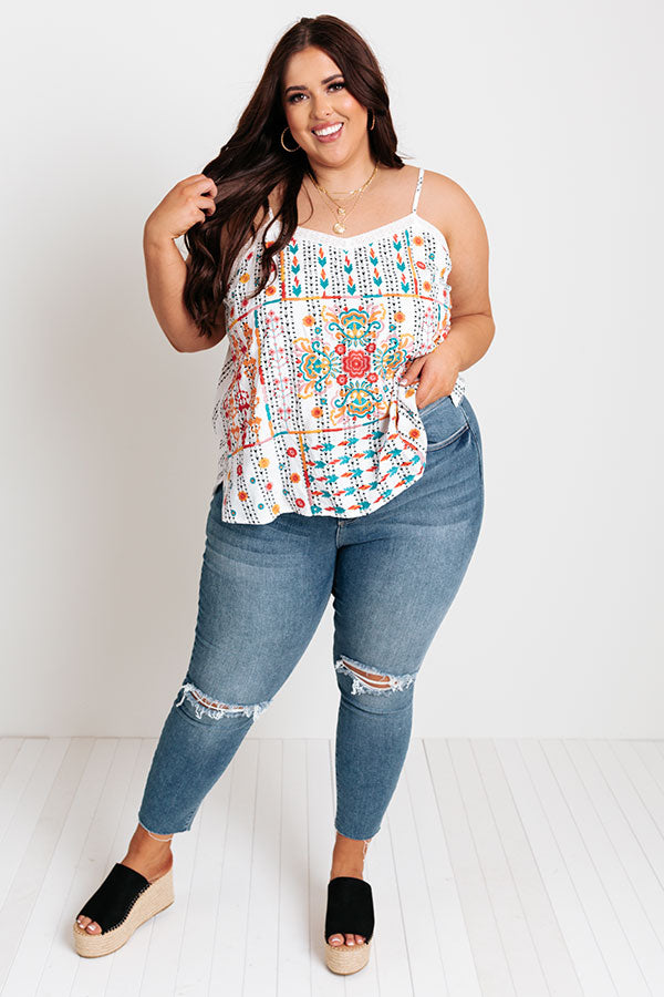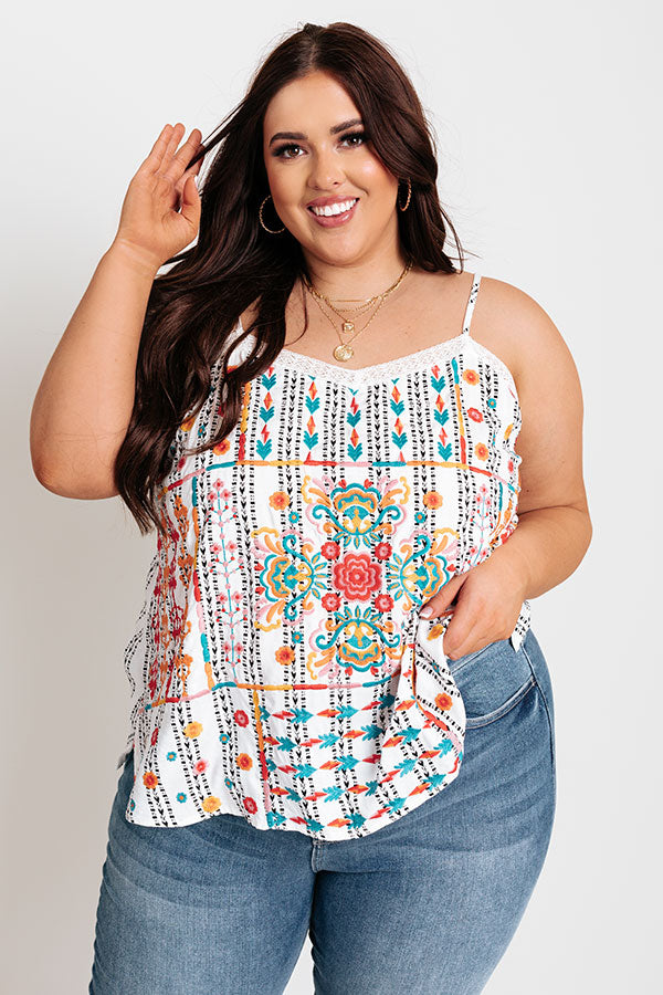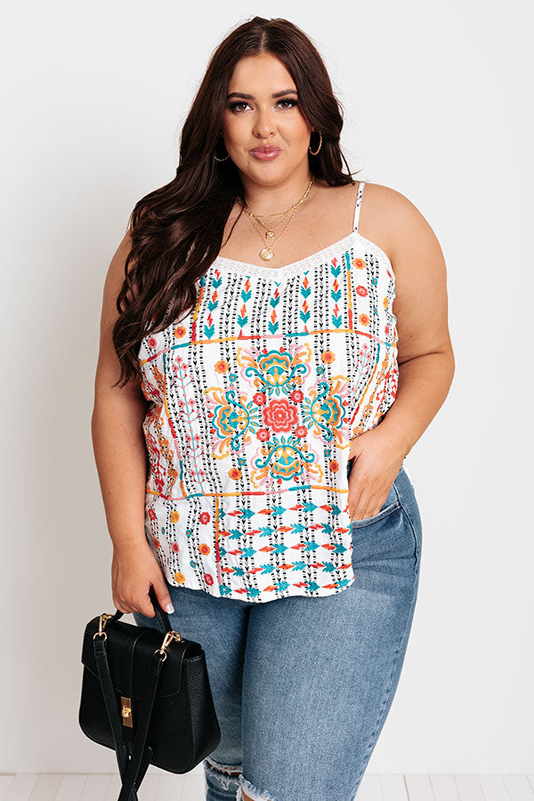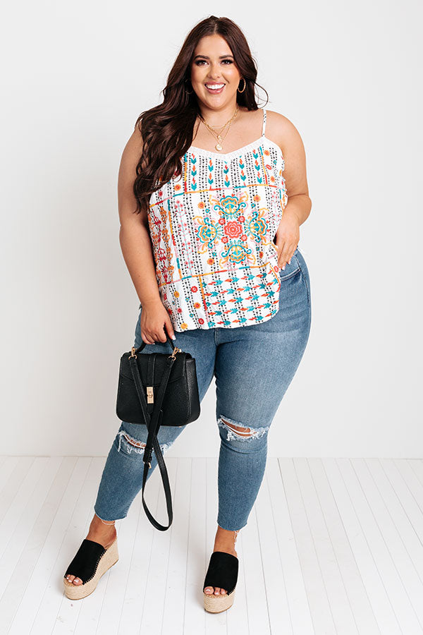 Plus Size - Take on any great adventure in style with this unique white tank featuring lightweight material with intricate and colorful embroidered detailing, a wide v-cut neckline, adjustable spaghetti straps, and a relaxed silhouette that falls into a straight hemline! Measurements