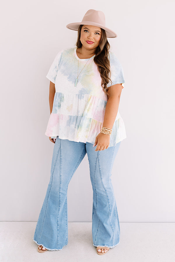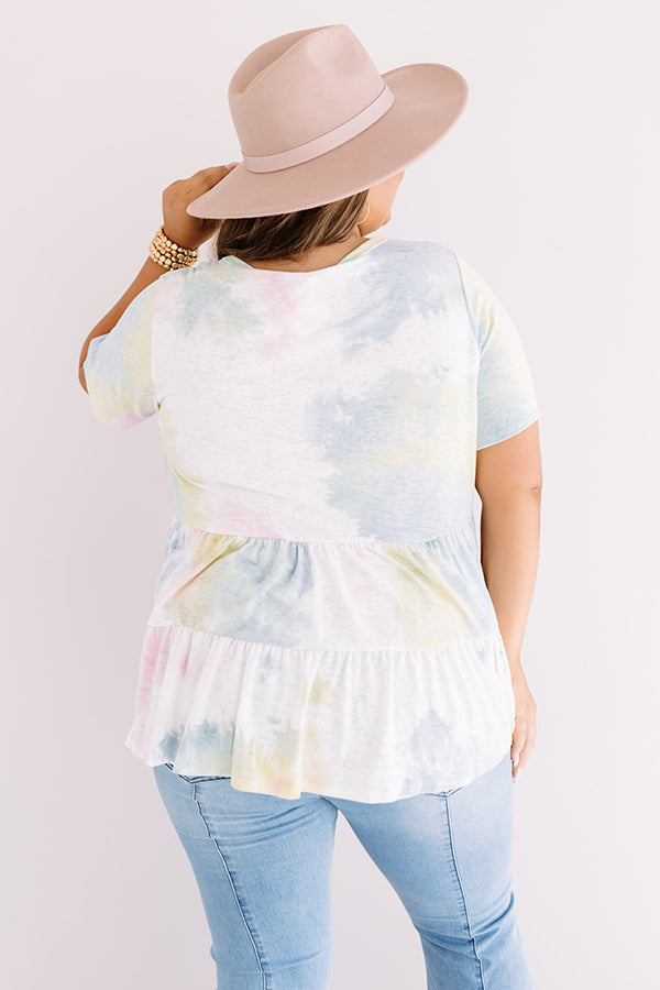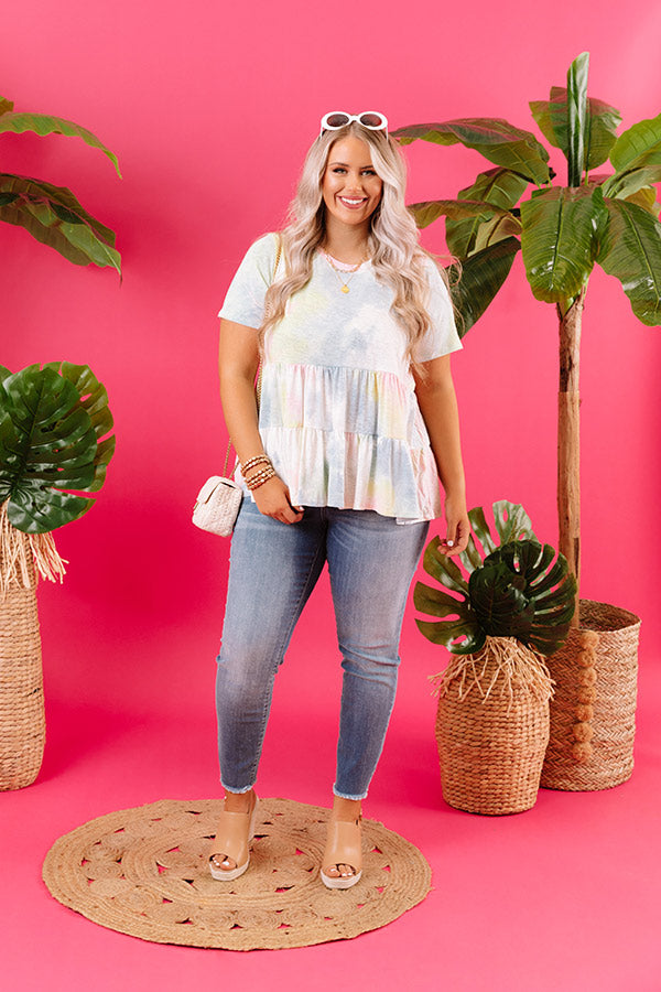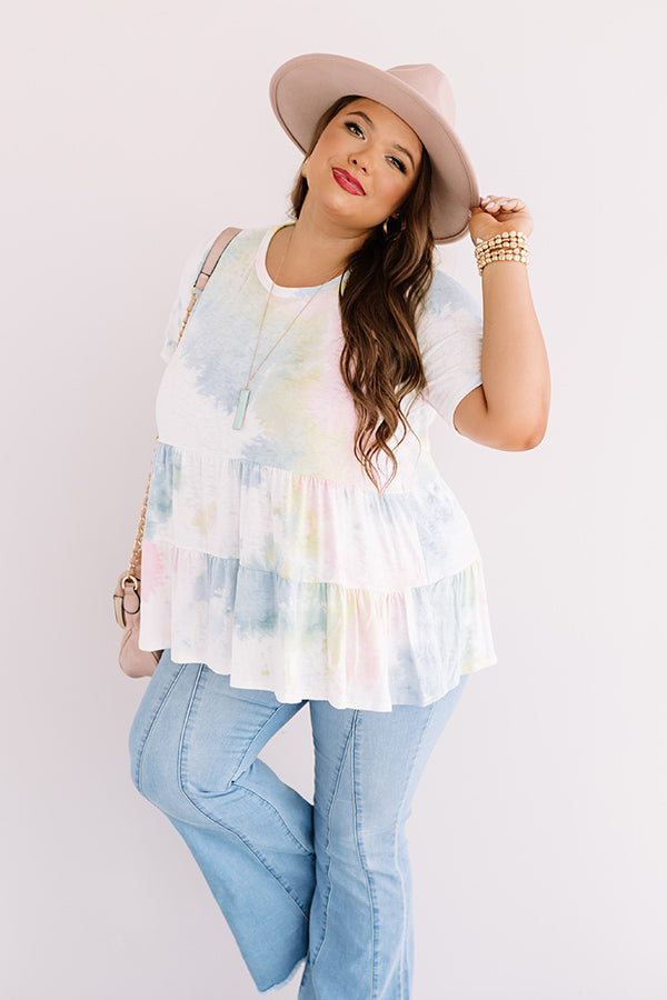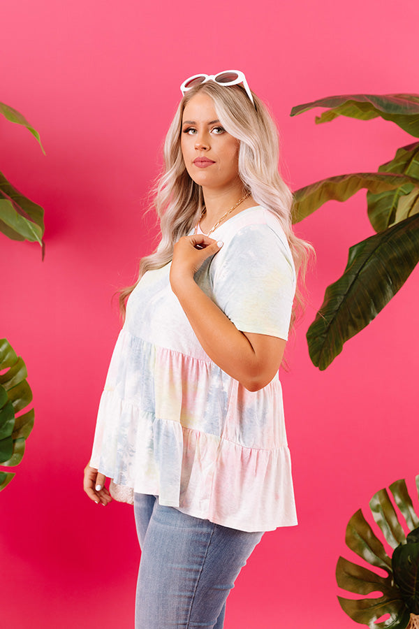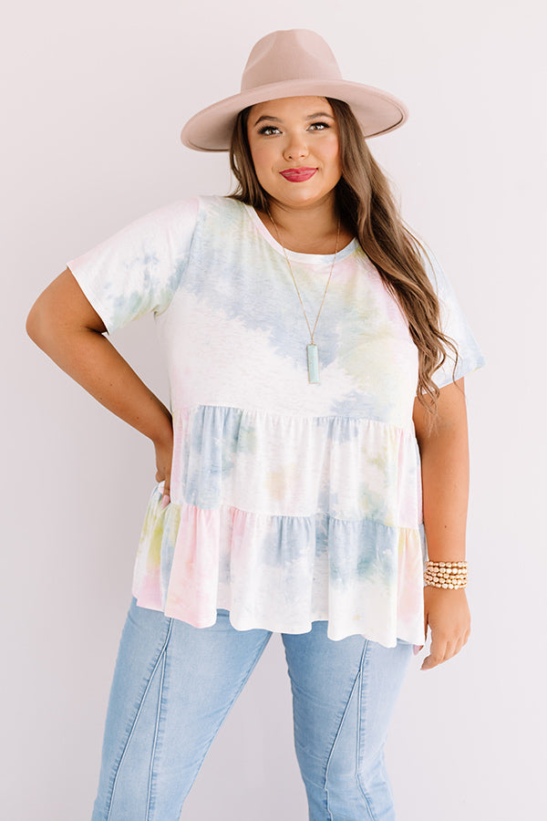Plus Size - This trendy top is sure to be a conversation starter with its lightweight material, blue, pink, and yellow tie dye print, high rounded neckline, short loose sleeves, and relaxed tiered babydoll silhouette that falls into an uneven hemline! Measurements