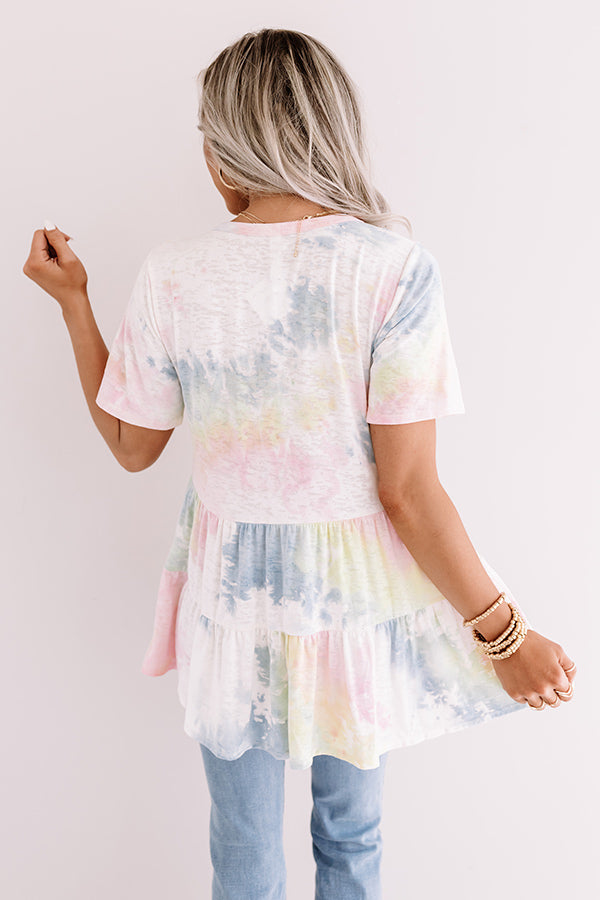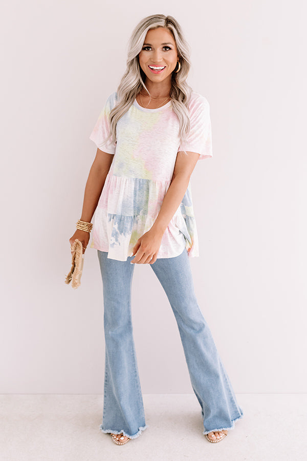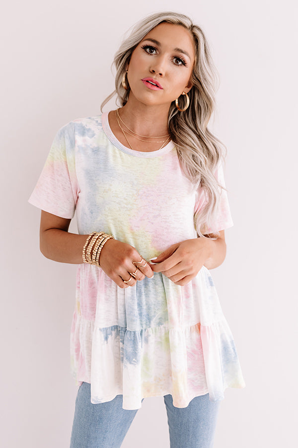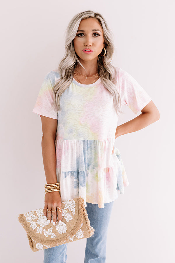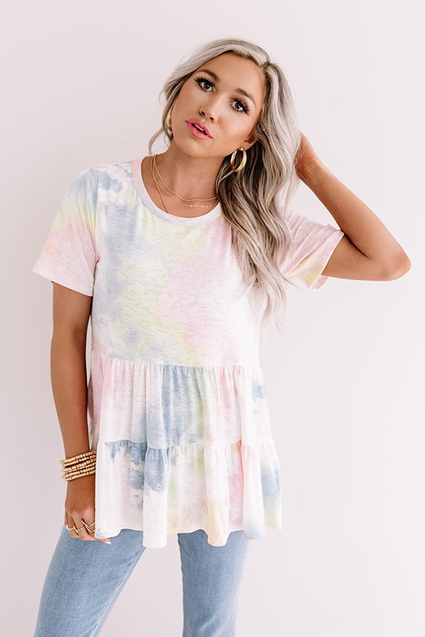 This trendy top is sure to be a conversation starter with its lightweight material, blue, pink, and yellow tie dye print, high rounded neckline, short loose sleeves, and relaxed tiered babydoll silhouette that falls into an uneven hemline! We have styled this cutie with some light wash flares, brown heels, and an embellished clutch, but it can also be worn with some frayed white shorts, "The Mara Sandal in Pink," and our "Brighton Beach Babe Hat!" Measurements
