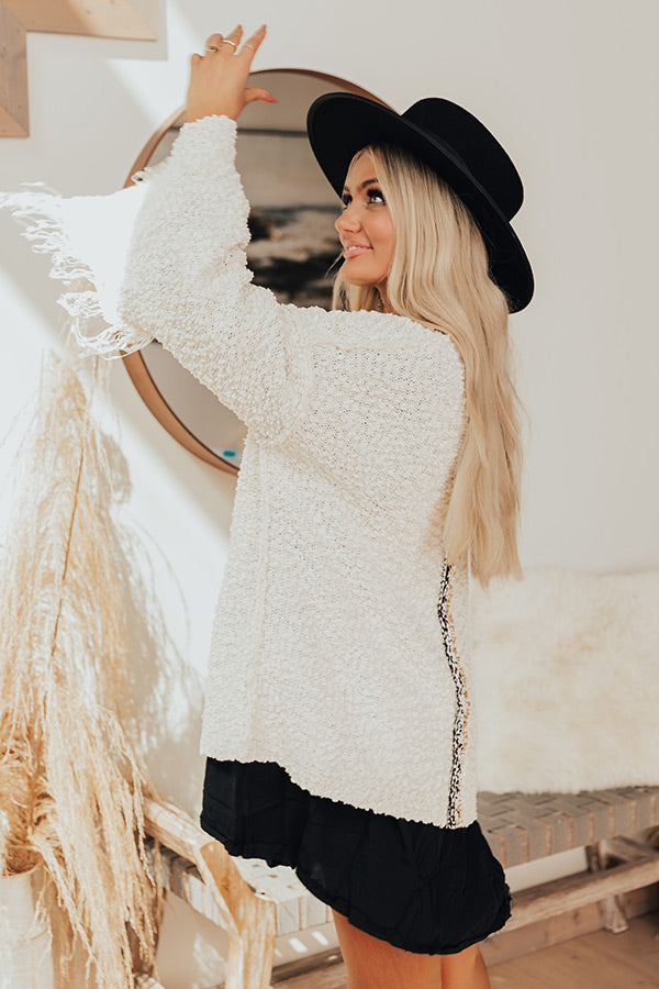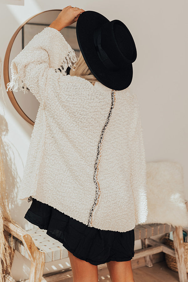 Finish off your look with greatness with this charming ivory hued cardigan featuring soft knit material with black and camel stripe panels down the front, long loose sleeves with flared fringe trim cuffs, and a draped open front silhouette that falls into a straight mid-thigh length hemline!
