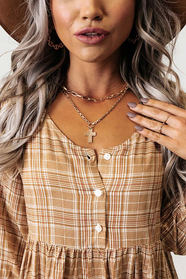 Accessorie effortlessly with our darling 'Greatness Calling Necklace' featuring a chain link choke and a longer smaller link chain with a gold cross charm!