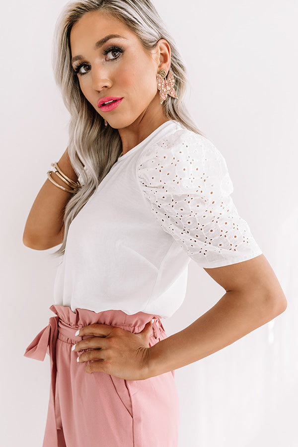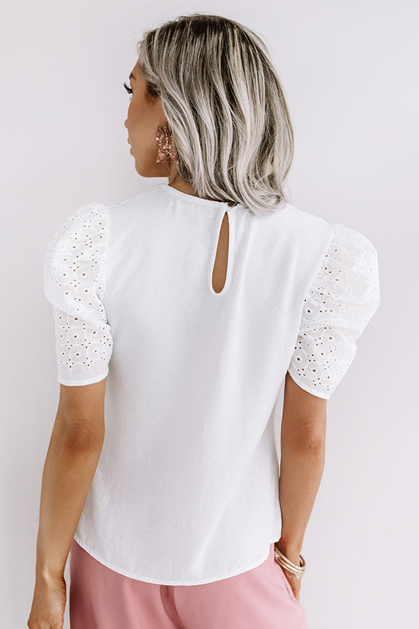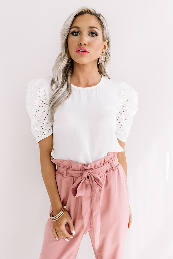 Add some versatility to your wardrobe with our elegant white "Grecian Sight Shift Top" featuring lightweight material, a high rounded neckline, short form fitting ruched sleeves with subtle eyelet detailing, a keyhole accented upper back with a button closure, and a figure flattering silhouette that falls into a straight hemline! We have styled this chic piece with some blush trousers and a neutral heel and crossbody for the ultimate girl boss look, but you can also dress it down with some distressed denim shorts, our "Five Star Jute Wedge in Hot Pink," and our hot pink "Jetsetter Chic Hair Scarf!" Measurements