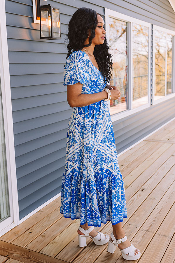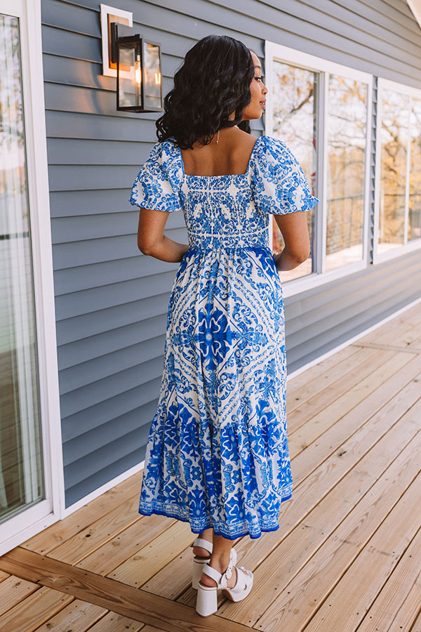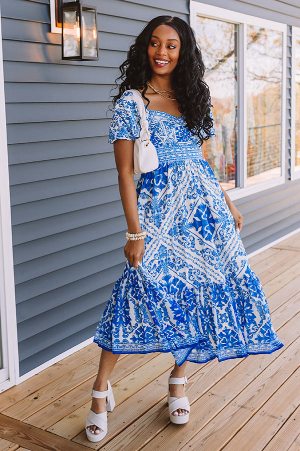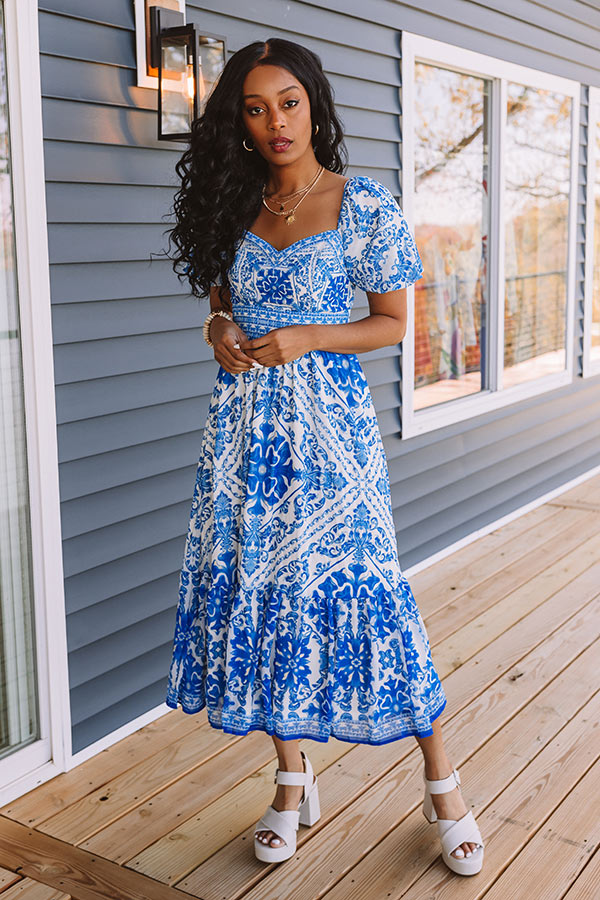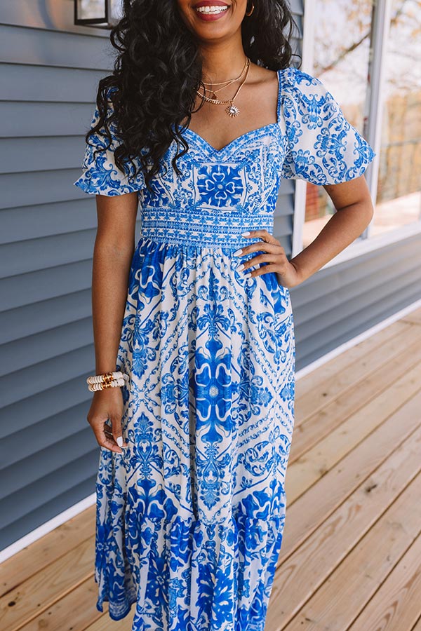 - Stay brunch date beautiful in this stylish dress! - Fully lined chiffon material with an abstract blue and ivory hued design - A sweetheart neckline - Puff sleeves with elastic cuffs - A bodice with a smocked back - A flowy, yet flattering silhouette that ends in a straight midi length hemline