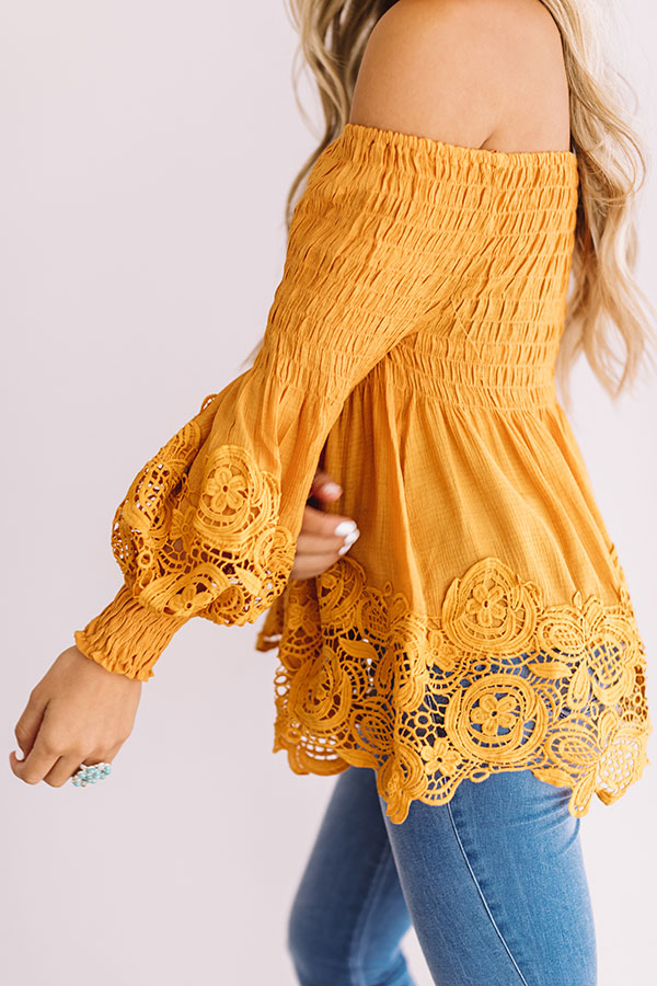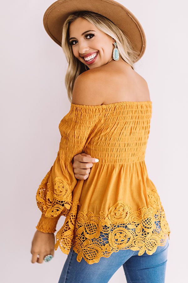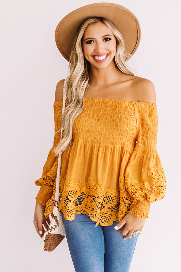 Greek Isle Getaway Crochet Off Shoulder Top In Orange
