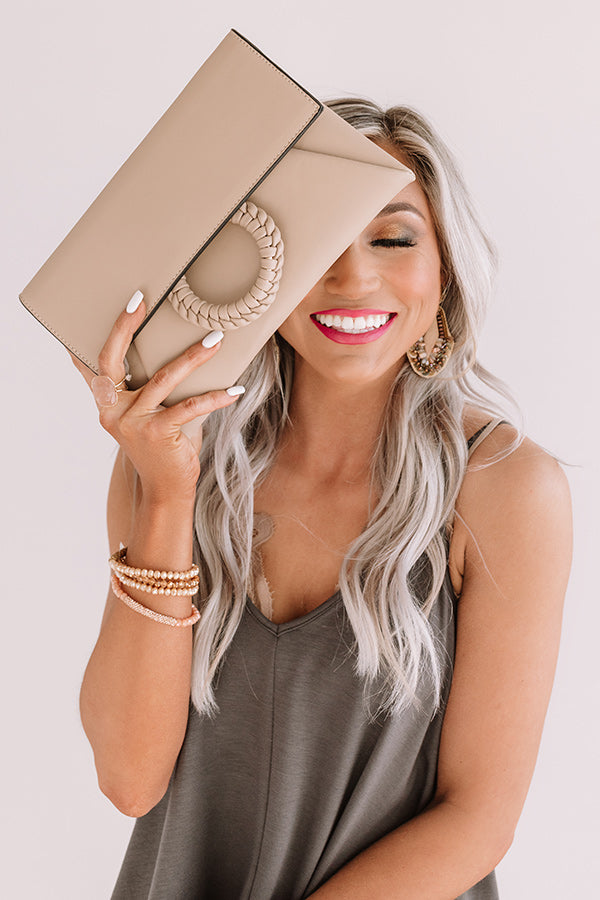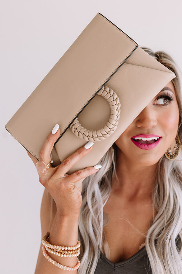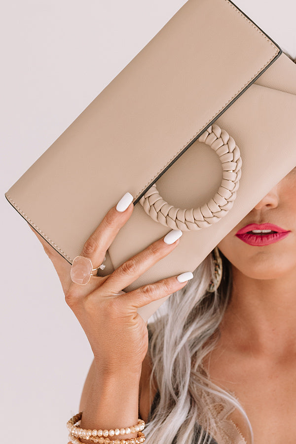 Make the street your runway by accessorizing with our adorable warm taupe colored "Greenwich Village" clutch featuring sleek faux leather material, an removable and adjustable shoulder strap with gold chain link detailing, a flap closure with a braided hoop accent, and a spacious fully lined rectangular pouch with additional inside pockets!