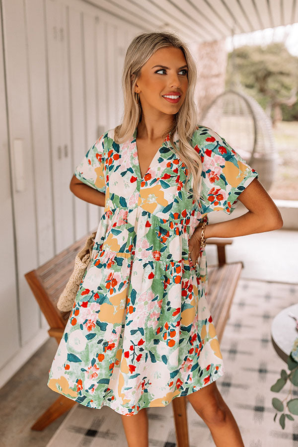 Wow the crowd in our gorgeous pear hued dress featuring lightweight material patterned with a pretty peach, coral, light yellow, and white floral print, a v-cut neckline and upper back with a tie closure, short sleeves, and a relaxed babydoll silhouette that falls into a straight mid-thigh length hemline!