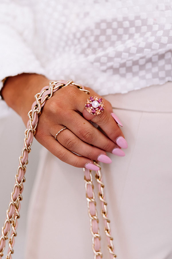 Make a statement with our stunning 'Guava Martini Ring' featuring a large pink resin band with shimmering rhinestone detailing! This ring is a size 7.