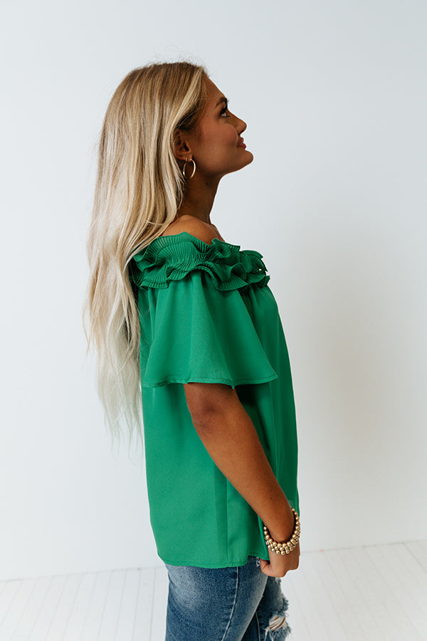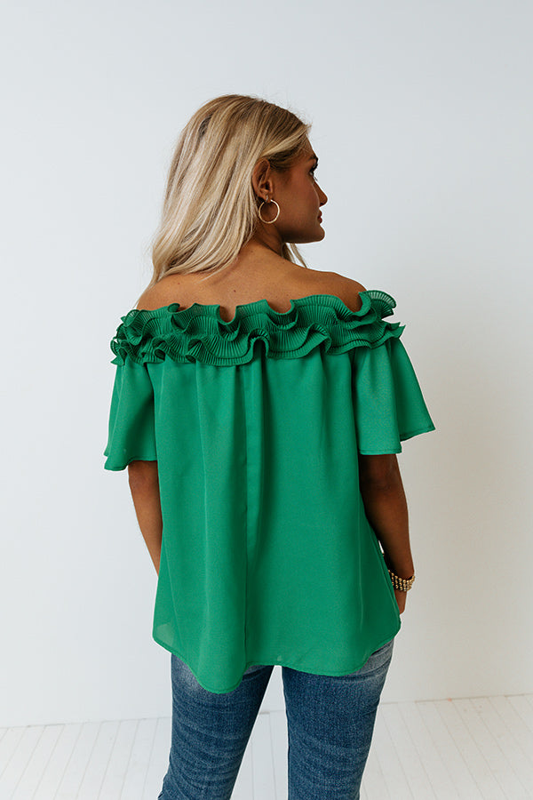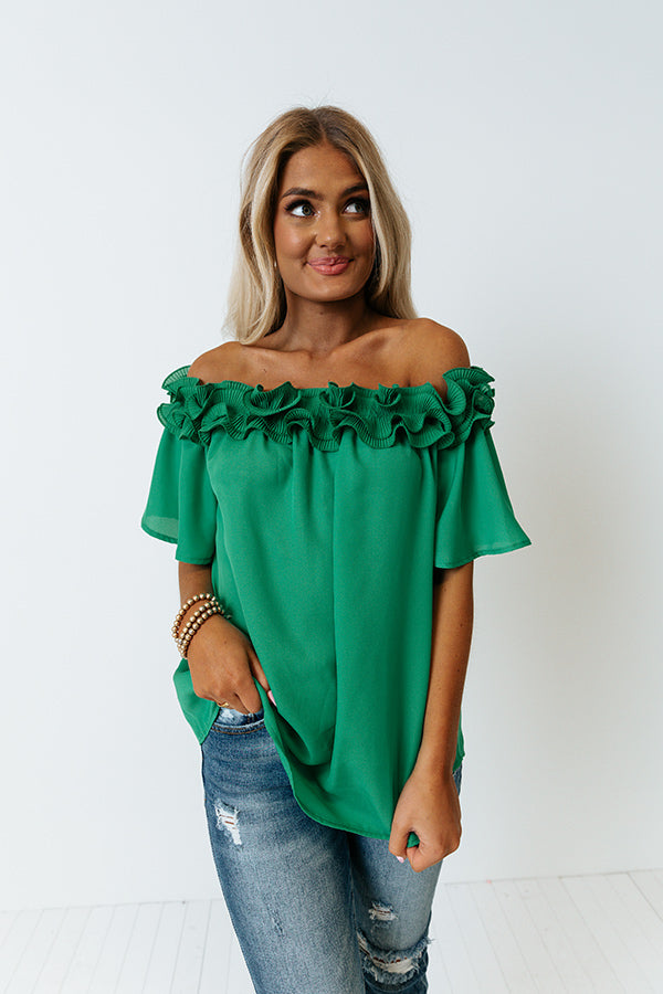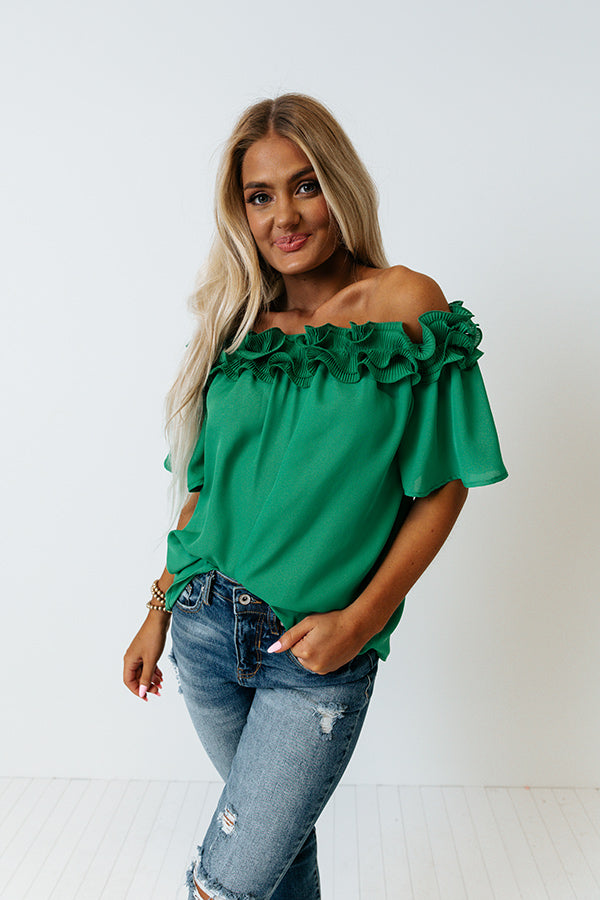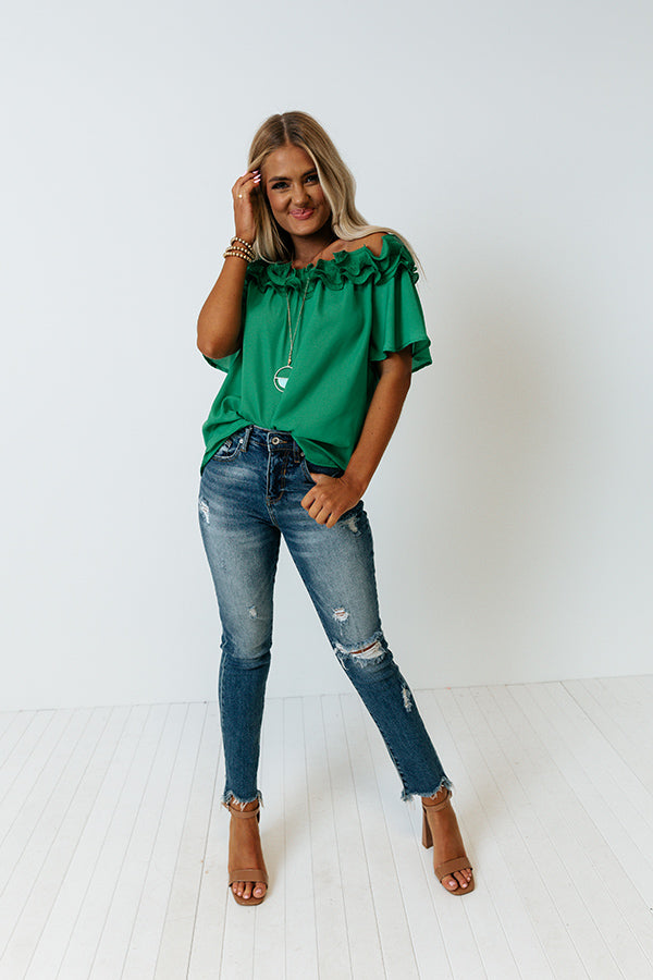 Nothing says "spring" like green! Our darling 'Guava Martini Top' features lightweight material, an ultra ruffled off-shoulder neckline, short loose drop sleeves, and a relaxed silhouette that falls into a straight hemline!
