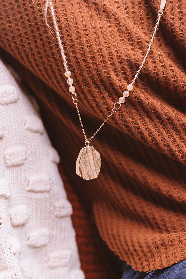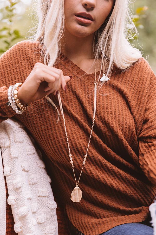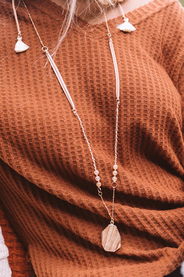 Arrive in style to any occasion by accessorizing with our adorable "Guest List Necklace" featuring a long dainty gold link chain with faux suede accent sections, beaded detailing, and a large neutral hued faux stone pendant!