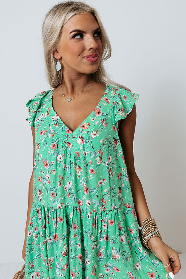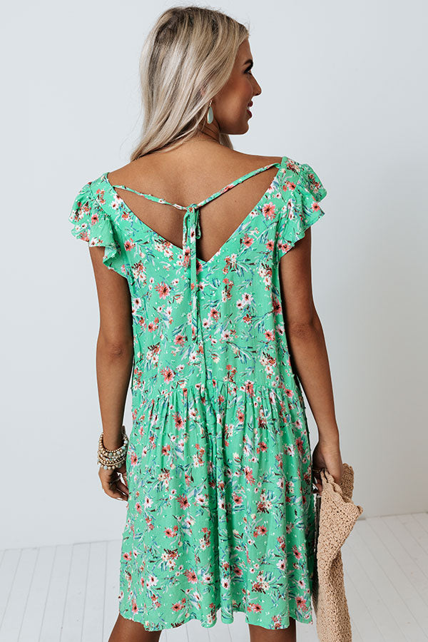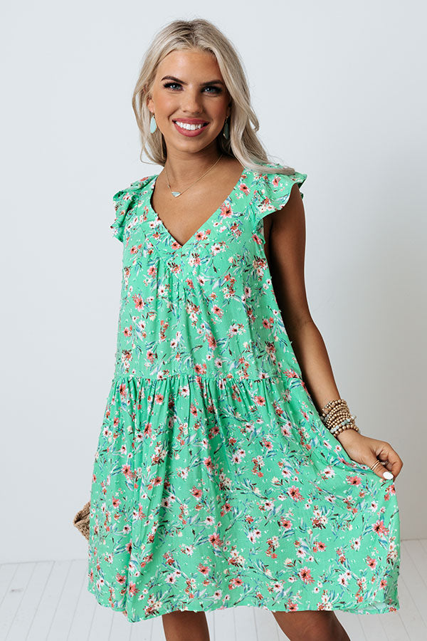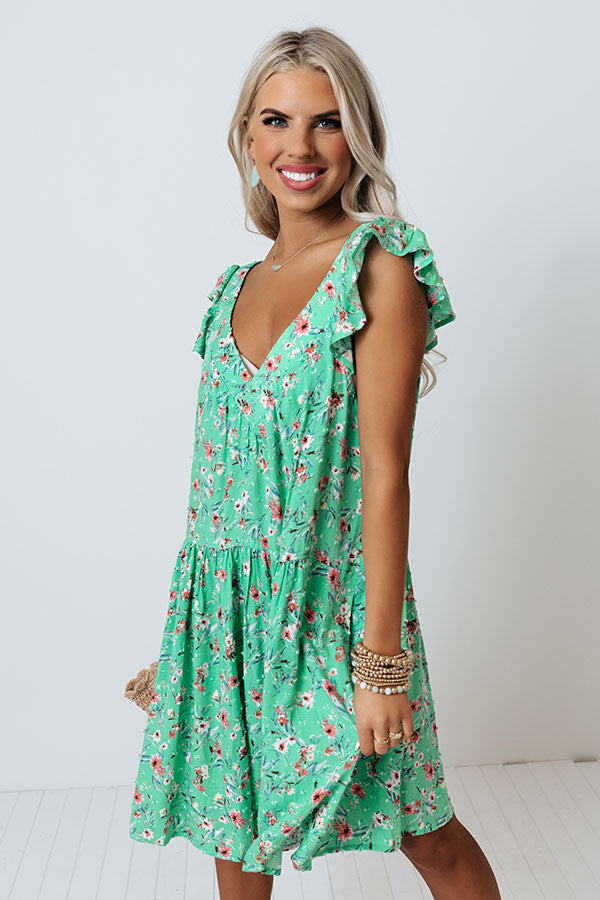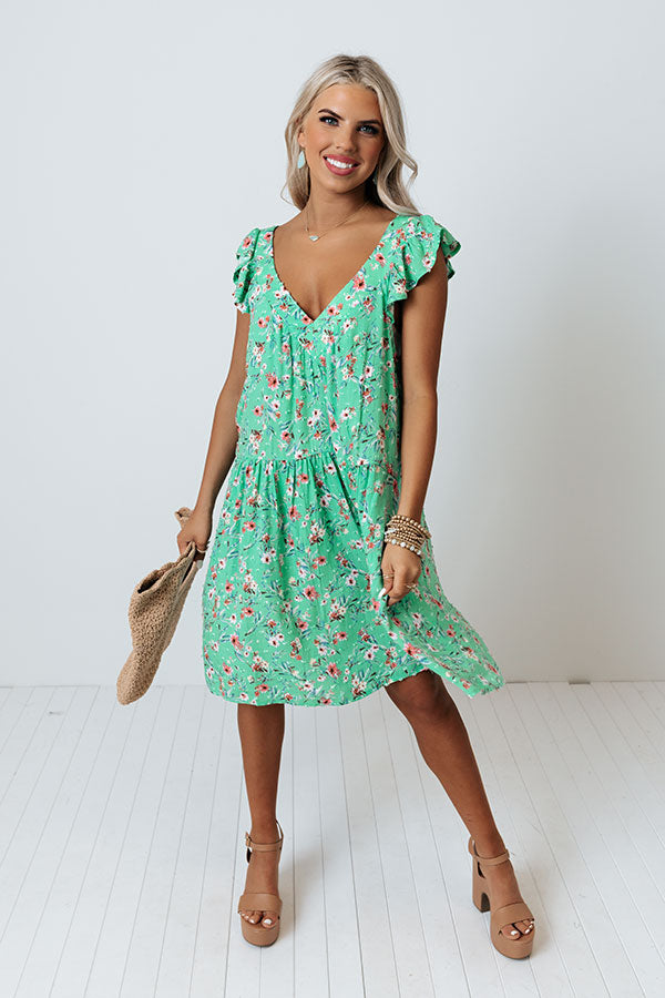 We don't blame you if online shopping is your guilty pleasure...especially when you are adding a dress this cute to your cart! This adorable kelly green piece features lightweight flowy material patterned with a pink and blue hued floral print, a v-cut neckline and upper back with a tie closure, ruffled cap sleeves, and a relaxed silhouette that falls into a straight mid-thigh length hemline!