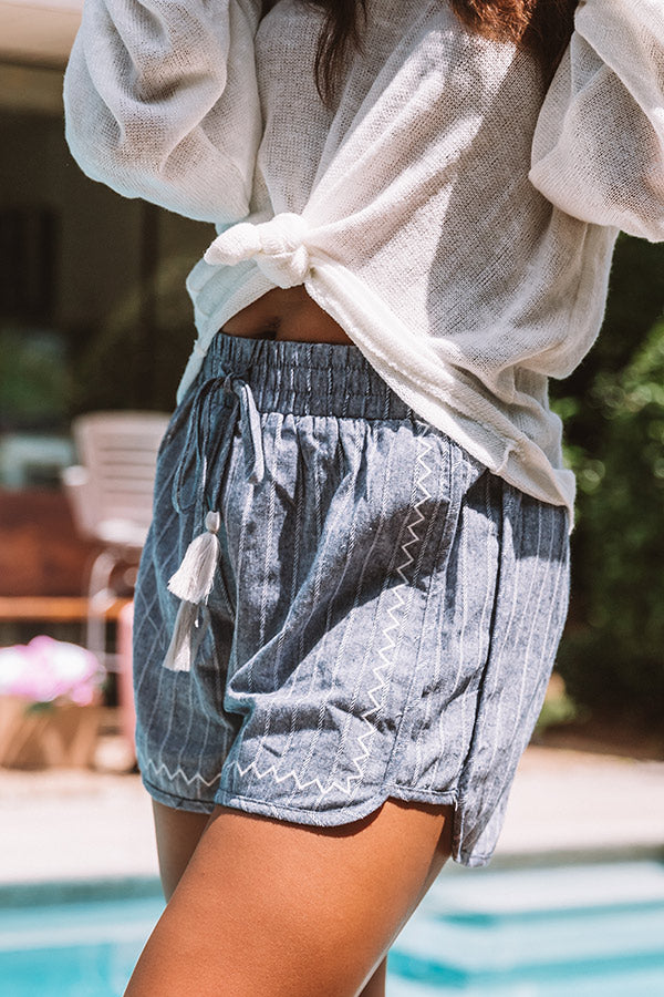 Stay cool in our adorable "Gulf Shores" shorts featuring lightweight medium wash chambray material patterned with vertical white accent stripes, zigzag trim detailing, a wide smocked high waistline with a tie belt closure, and a relaxed silhouette that falls into rounded upper-thigh length hemlines! Style with your favorite basic tee, tank, or lightweight sweater, an oversized tote or crossbody, sunnies, and some neutral wedges or colored sandals for a variety of fashion forward summer looks! Measurements