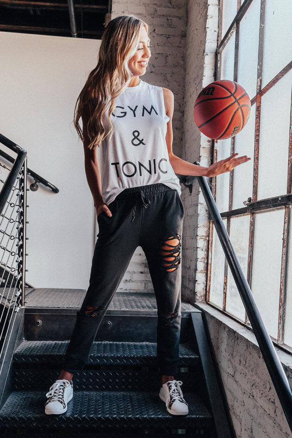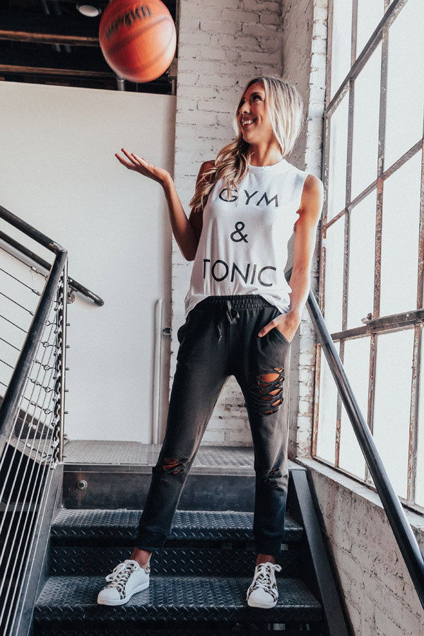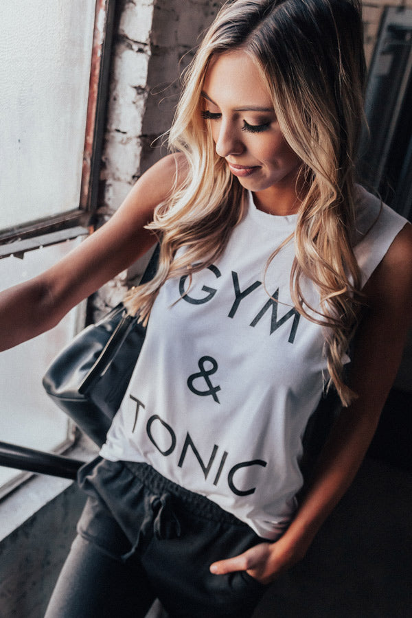 Our adorable white "Gym And Tonic Shift Tank" features soft lightweight material, a scooped neckline, wide 3-inch shoulder straps, adorable black lettering on the front, a racerback fit, and a relaxed silhouette that falls into a straight hemline! This adorable athleisure piece styles perfectly with a variety of joggers or leggings and trendy sneakers for the ultimate workout look!
