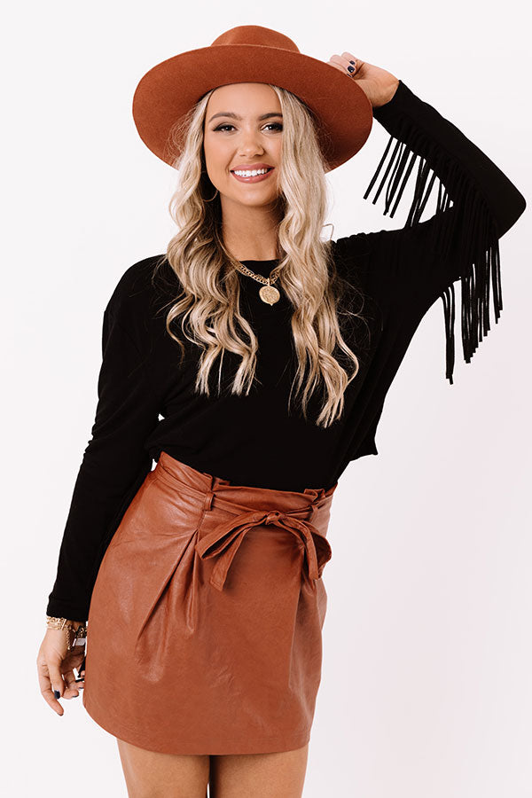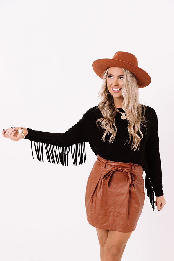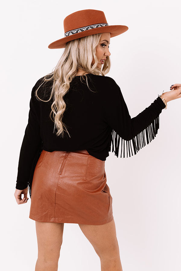 Let your gypsy soul run free in this boho inspired black top featuring lightweight material, a high rounded neckline, loose 3/4-length sleeves with fringe detailing down the sides, and a relaxed silhouette that ends in a straight cropped hemline!