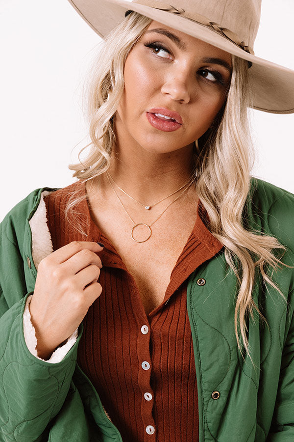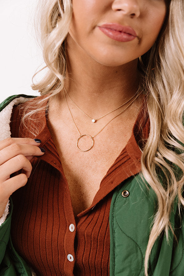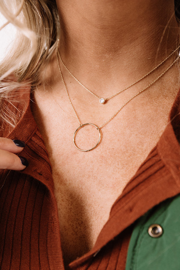 Let your gypsy soul be free with this gorgeous gold necklace featuring two dainty chains, one with a tiny rhinestone charm and one with a large skinny hoop!
